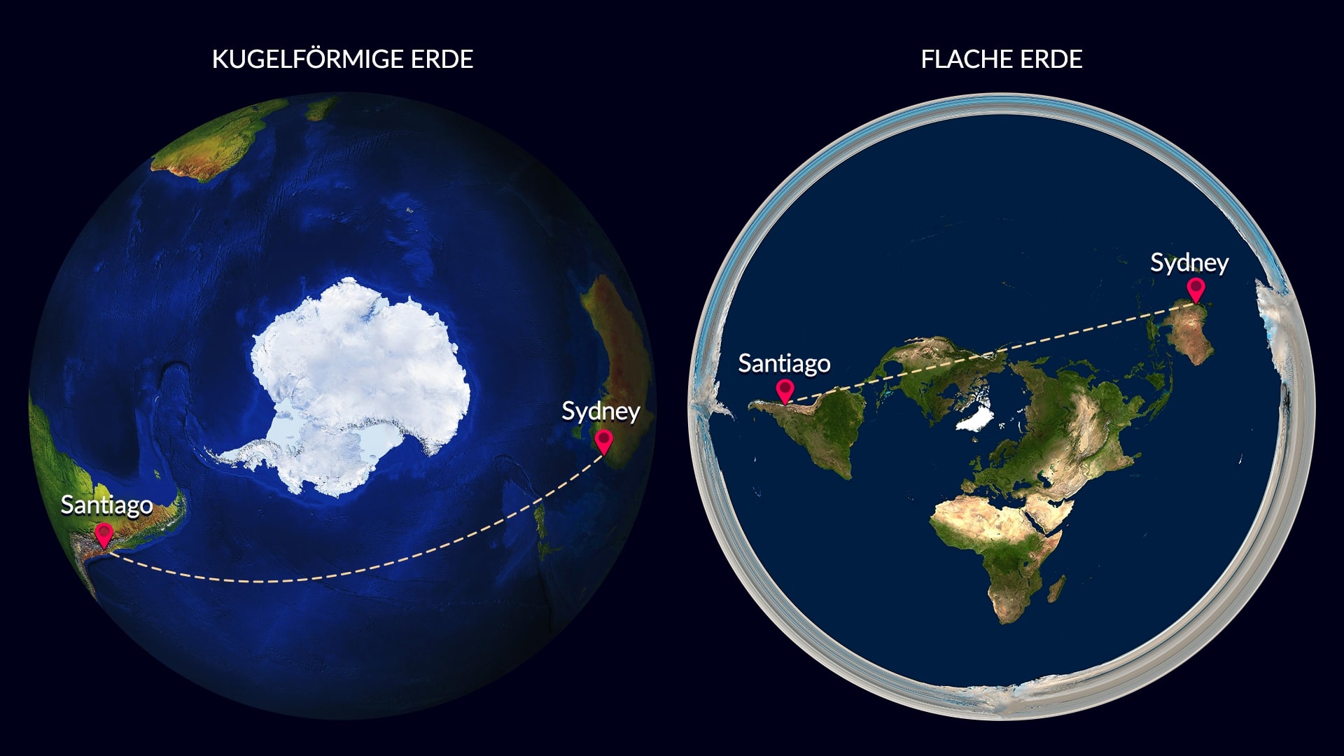 Nehmen wir als Beispiel einen Flug von Santiago in Chile nach Sydney in Australien. Auf einer flachen Erde sähe die kürzeste Route wie folgt aus: Ein Flugzeug müsste ganz Südamerika und Nordamerika überfliegen und dann den Ozean überqueren, um Sydney zu erreichen. Wie fliegen echte Flugzeuge zwischen diesen beiden Städten? Googeln Sie einfach danach, dann werden Sie feststellen, dass kommerzielle Flugzeuge nur den Pazifik überqueren müssen, um von Santiago nach Sydney zu fliegen. Wenn Sie Google nicht trauen, buchen Sie selbst einen solchen Flug, schauen Sie aus dem Fenster und versuchen Sie während des Flugs, Nordamerika unter sich zu entdecken.