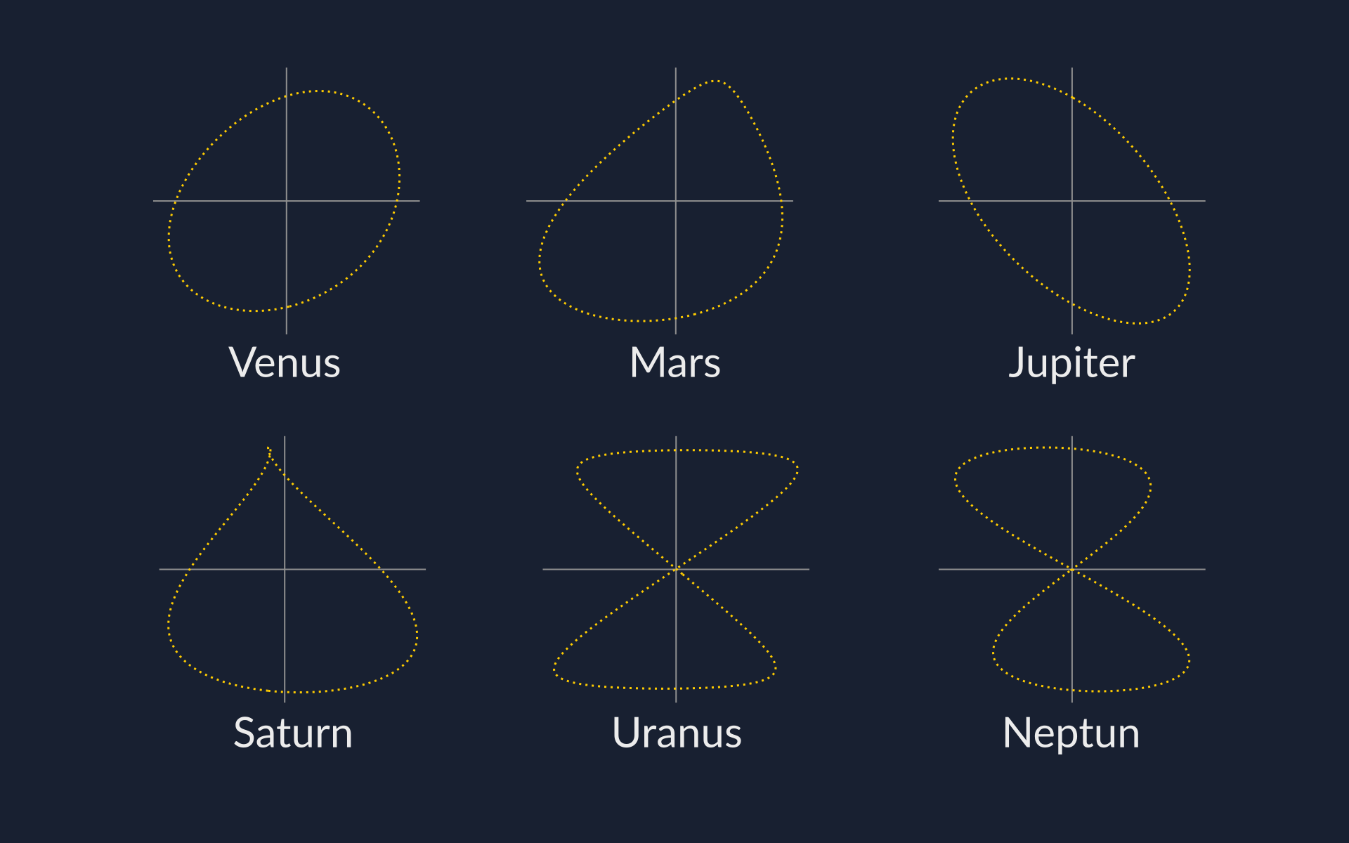Das Analemma vom Merkur aus gesehen ist sehr einfach. Bei einer geringen axialen Neigung (weniger als ein Grad) ist sein Analemma nur ein Punkt. Die Analemmata von Venus und Jupiter haben eine elliptische Form. Saturn? Denken Sie an eine Träne mit einer kleinen Schleife. Neptun und Uranus? Auch sie haben ein Achtermuster.