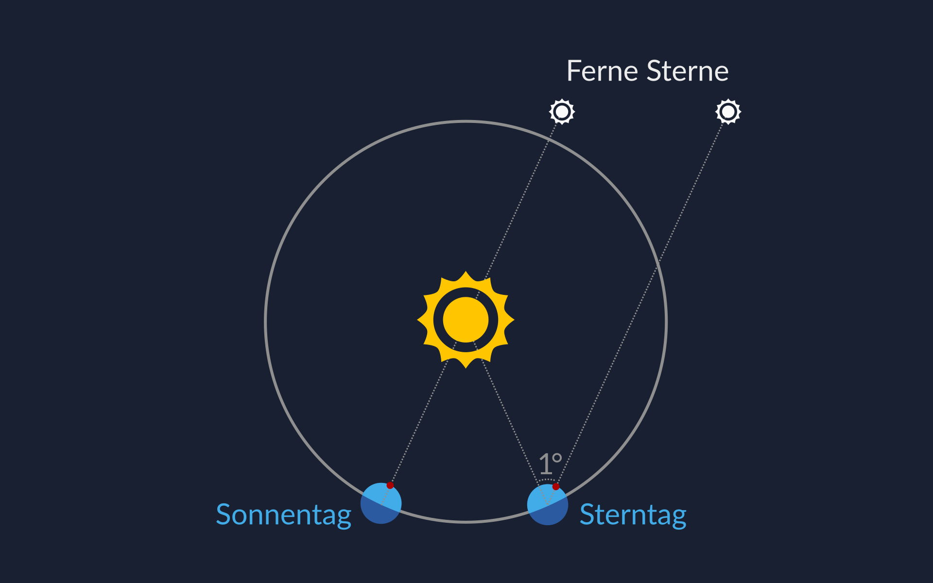 Die Erde dreht sich in etwa 23 Stunden und 56 Minuten einmal um ihre eigene Achse. Die Sonne benötigt jedoch weitere 4 Minuten, um wieder am gleichen Punkt des Himmels oder des lokalen Meridians zu stehen (dies wird als Sonnentag bezeichnet). Wenn man eine Sonnenuhr aufstellt und die Stoppuhr an einem Tag um 12 Uhr mittags startet und am nächsten Tag um 12 Uhr mittags stoppt, misst man einen Sonnentag.