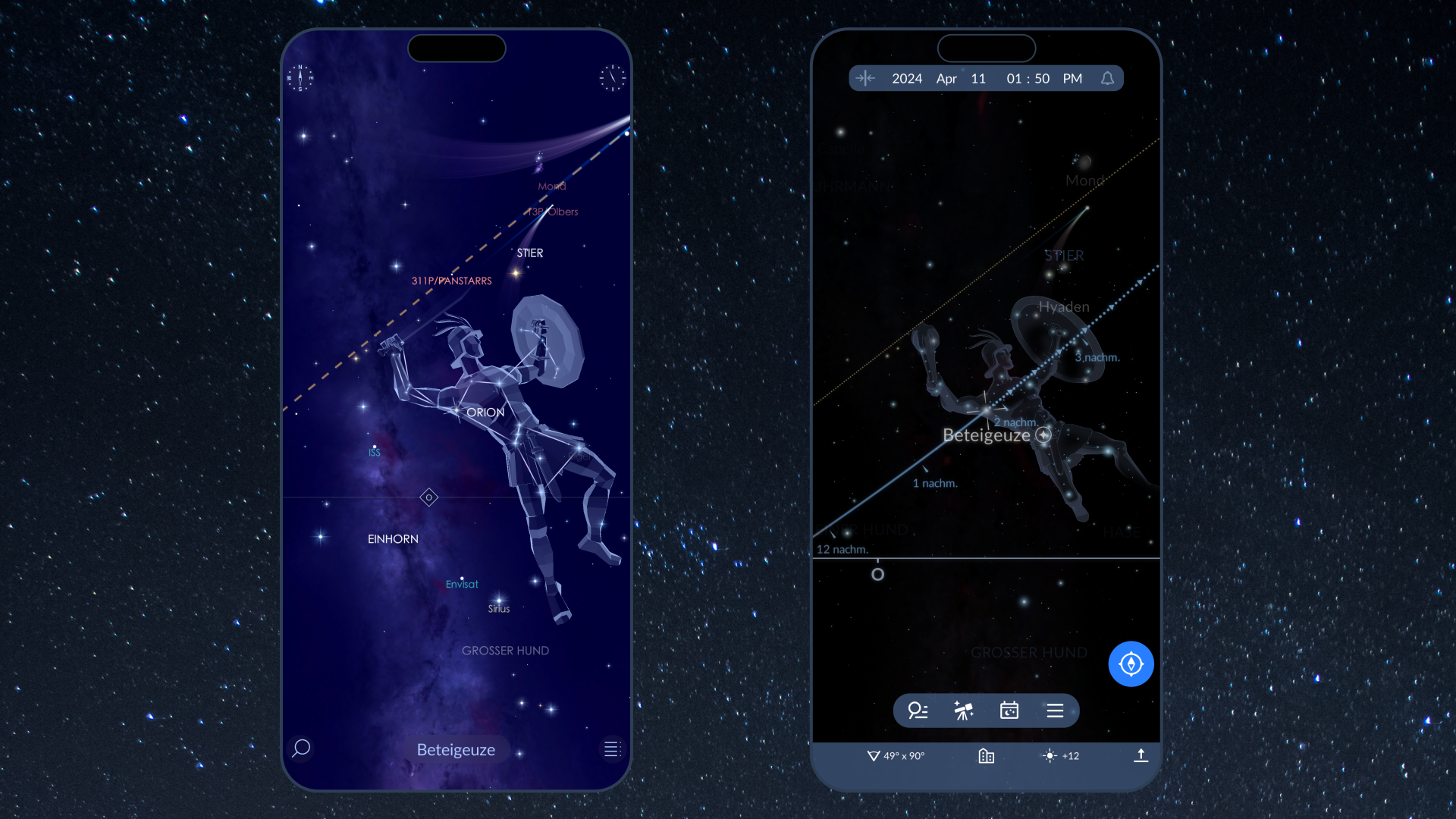Um Beteigeuze leicht am Nachthimmel zu finden, empfiehlt sich eine Astronomie-App wie Star Walk 2 oder Sky Tonight. Geben Sie einfach „Beteigeuze“ in die Suchleiste ein, wählen Sie den Stern aus den Suchergebnissen und richten Sie Ihr Gerät auf den Himmel. Folgen Sie dann dem Pfeil auf dem Bildschirm, bis Sie den rötlich leuchtenden Stern Beteigeuze auf der Himmelskarte der App und am echten Himmel über sich sehen.