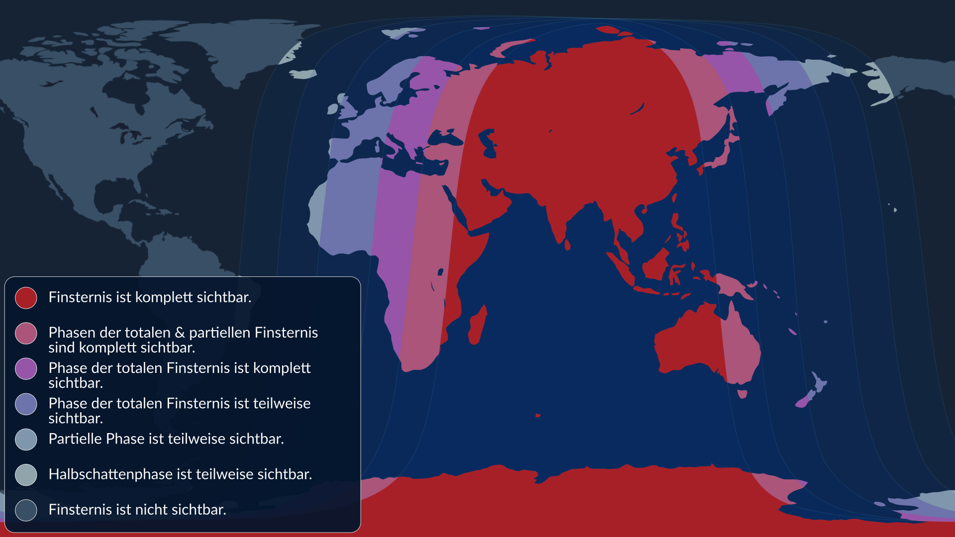 - Mindestens ein Teil der totalen Finsternis ist in Europa, Asien, Ost-Australien, Afrika und Neuseeland sichtbar.