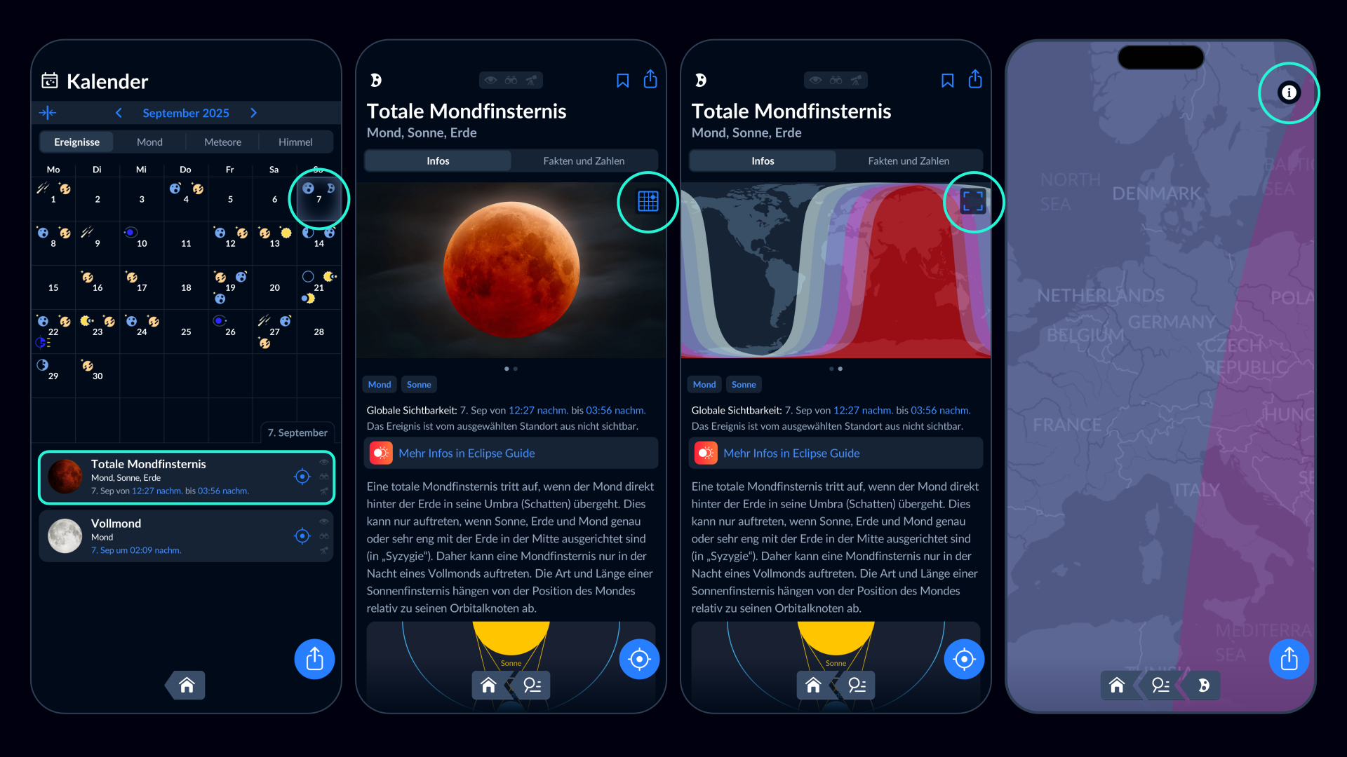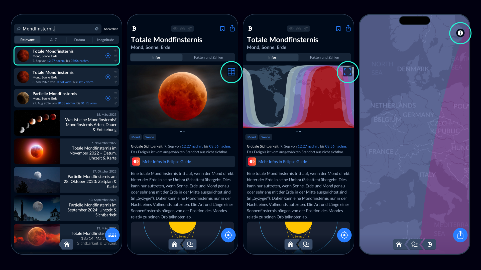 Ein Beispiel ist die Eclipse Guide App. Ihre interaktiven Karten zeigen die gesamte Finsternis von Anfang bis Ende – inklusive der Orientierung des Mondes entsprechend deinem Standort.