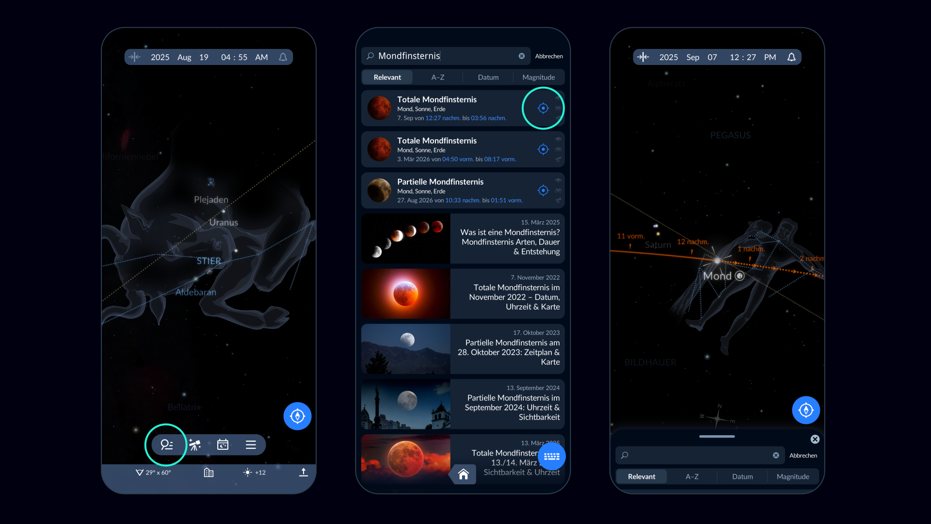 Mit der kostenlosen Astronomie-App Sky Tonight findest du ganz einfach heraus, ob die Finsternis an deinem Standort sichtbar ist.