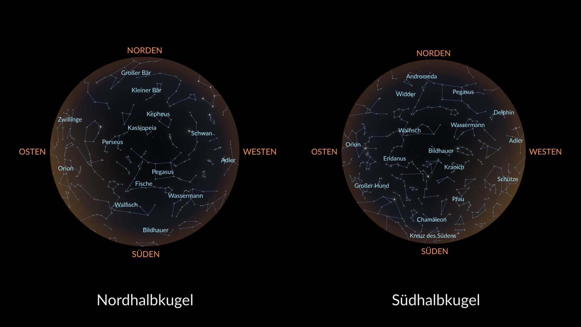 Am nördlichen Oktoberhimmel findet man die Sternbilder Wassermann, Kranich, Eidechse, Oktant, Pegasus und Südlicher Fisch. Und natürlich sind die zirkumpolaren Sternbilder wie der Grosse Bär und Kassiopeia immer zu sehen – sie sinken nie unter den Horizont.