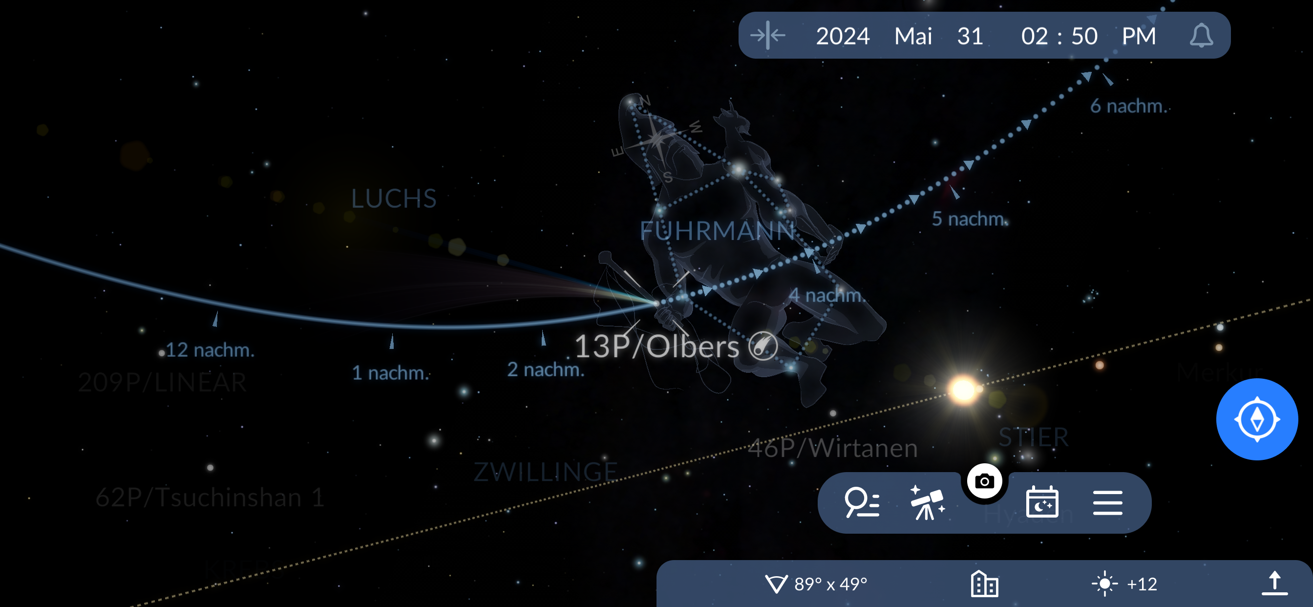 Am einfachsten lässt sich der Komet mit der App Sky Tonight finden. Einfach die App öffnen, 13P/Olbers in die Suchleiste eingeben, auf den Ziel-Button neben dem entsprechenden Ergebnis tippen und schon wird die Position des Kometen auf der Himmelskarte angezeigt. Tippen Sie dann auf den blauen Kompass-Button oder richten Sie einfach Ihr Gerät auf den Himmel und – voilà – die Himmelskarte der App passt sich in Echtzeit an Ihren Himmel an. Folgen Sie dem weißen Pfeil auf dem Bildschirm, bis Sie 13P/Olbers sehen. Fertig, Sie haben die Position des Kometen am Himmel gefunden. Viel Spaß beim Beobachten!