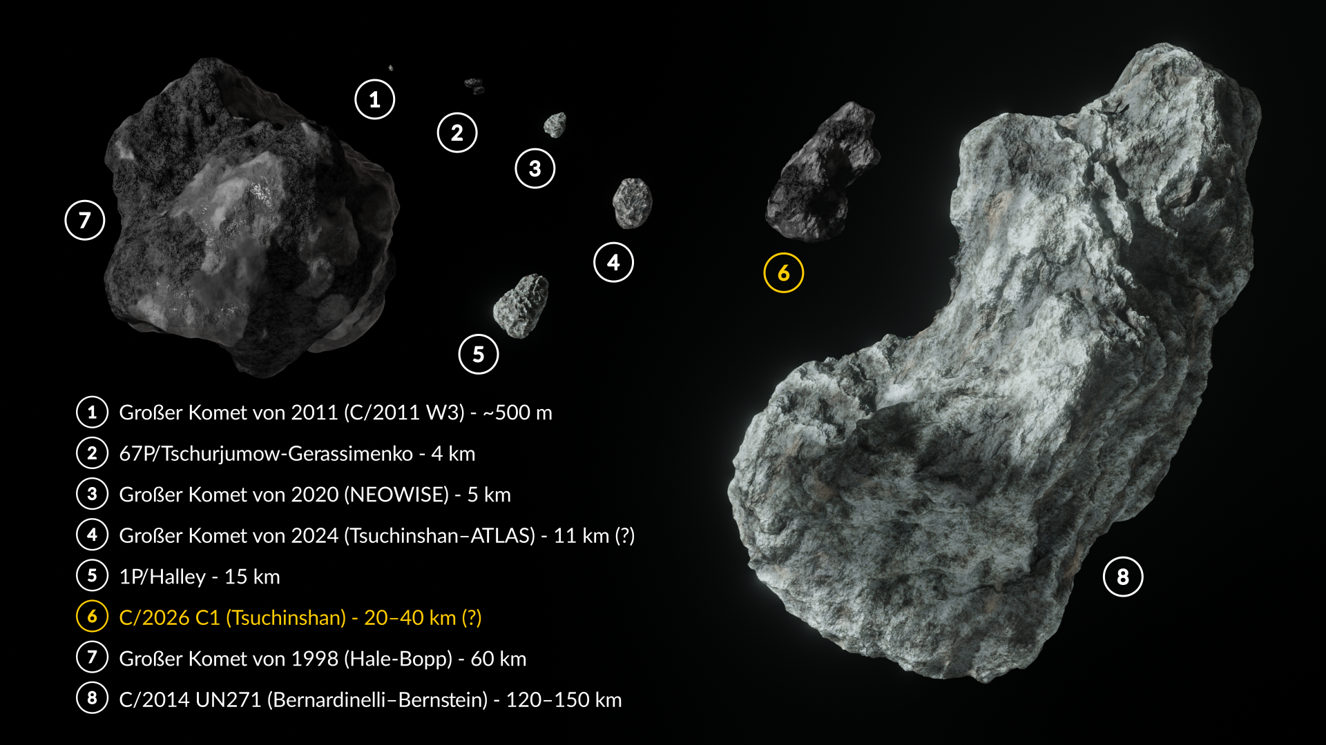 Astronomen können die genaue Größe des Kometen C/2026 C1 (Tsuchinshan) noch nicht messen, aber seine Helligkeit in einer so großen Entfernung deutet darauf hin, dass der Kern sehr groß sein könnte – möglicherweise 20 bis 40 Kilometer im Durchmesser –, was etwa der Breite einer großen Stadt entspricht. Zum Vergleich: Der Komet 67P/Churyumov-Gerasimenko – der erste Komet, der jemals von einem Raumschiff besucht und angeflogen wurde – hat einen Kern mit einem Durchmesser von etwa 4 km. Der Komet C/1995 O1 (Hale-Bopp), einer der spektakulärsten mit bloßem Auge sichtbaren Kometen des späten 20. Jahrhunderts, hatte schätzungsweise einen Kern mit einem Durchmesser von etwa 60 km. Der größte bekannte Kometenkern gehört zu C/2014 UN271 (Bernardinelli–Bernstein) und hat einen Durchmesser von schätzungsweise 120 bis 150 km (dieser Riese wird erst im Januar 2031 sein Perihel erreichen und sich etwa 10,95 AE von der Sonne entfernt befinden – viel zu weit entfernt, um das leuchtende Schauspiel zu bieten, auf das sich Himmelsbeobachter normalerweise hoffen). C/2026 C1 ist also vielleicht nicht der Rekordhalter – aber es könnte dennoch ein wirklich großer Komet sein.