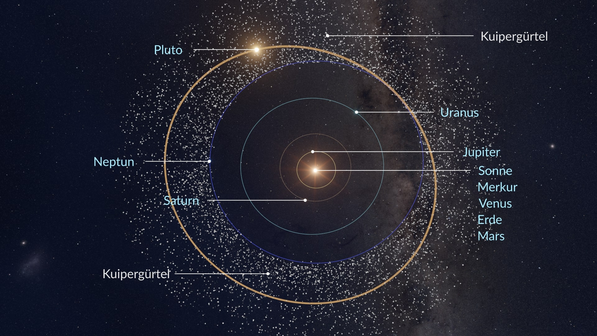 Pluto ist ein Mitglied des Kuipergürtels – einer donutförmigen Region jenseits der Umlaufbahn von Neptun, die von Tausenden kleiner Eiskörper bevölkert ist. Diese Körper (bekannt als Kuipergürtel-Objekte, transneptunische Objekte oder Plutoide) sind Überbleibsel aus der Entstehung des Sonnensystems vor etwa 4,5 Milliarden Jahren.