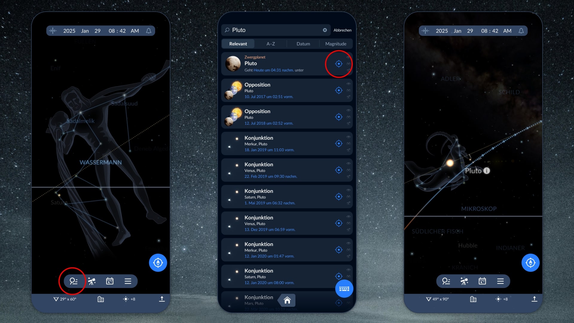 Pluto ist nicht leicht zu beobachten. Selbst mit einem Teleskop erscheint er nur als sehr schwacher, sternähnlicher Punkt, der sich kaum von den Hintergrundsternen unterscheidet. Mit der Astronomie-App Sky Tonight können Sie jedoch den Nachthimmel erkunden und schwer auffindbare Objekte wie Pluto lokalisieren. Tippen Sie dazu auf das Lupensymbol im unteren Bereich des Hauptbildschirms, geben Sie den Namen des Zwergplaneten in das Suchfeld ein und tippen Sie auf das blaue Zielsymbol neben dem entsprechenden Ergebnis. Ein schneller Tipp: Pluto ist am besten zur Opposition sichtbar, wenn er am hellsten erscheint und sich am längsten am Nachthimmel aufhält.