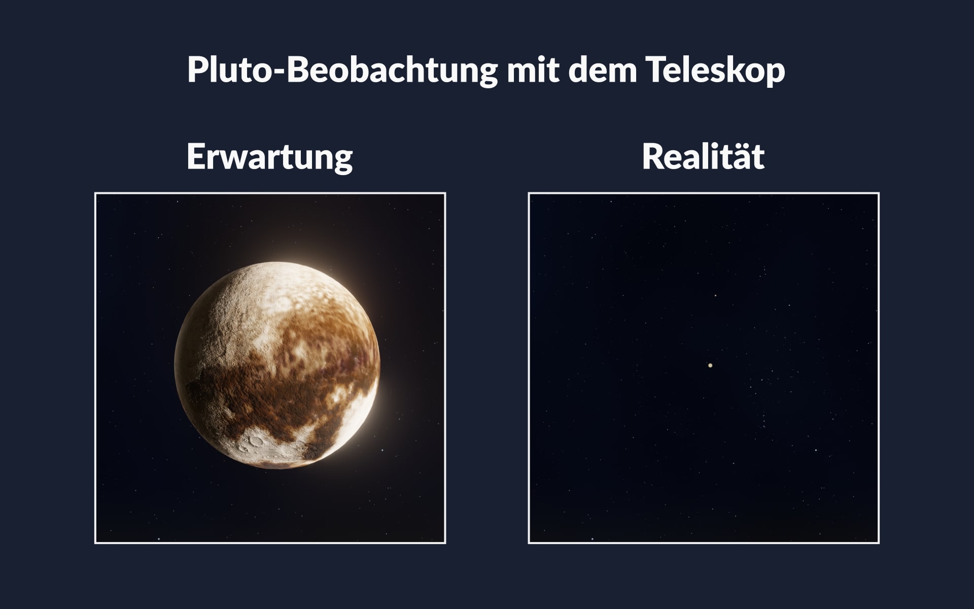 Wegen seiner großen Entfernung von der Sonne ist Pluto mit bloßem Auge nicht sichtbar. Mit einer scheinbaren Helligkeit von etwa 14,1 mag ist er im Vergleich zu Sternen und Planeten, die ohne optische Hilfsmittel sichtbar sind, ziemlich lichtschwach. Selbst in den besten Amateurteleskopen erscheint Pluto nur wenig größer als ein Stern, aber feinere Details sind für die meisten Geräte unerreichbar.
