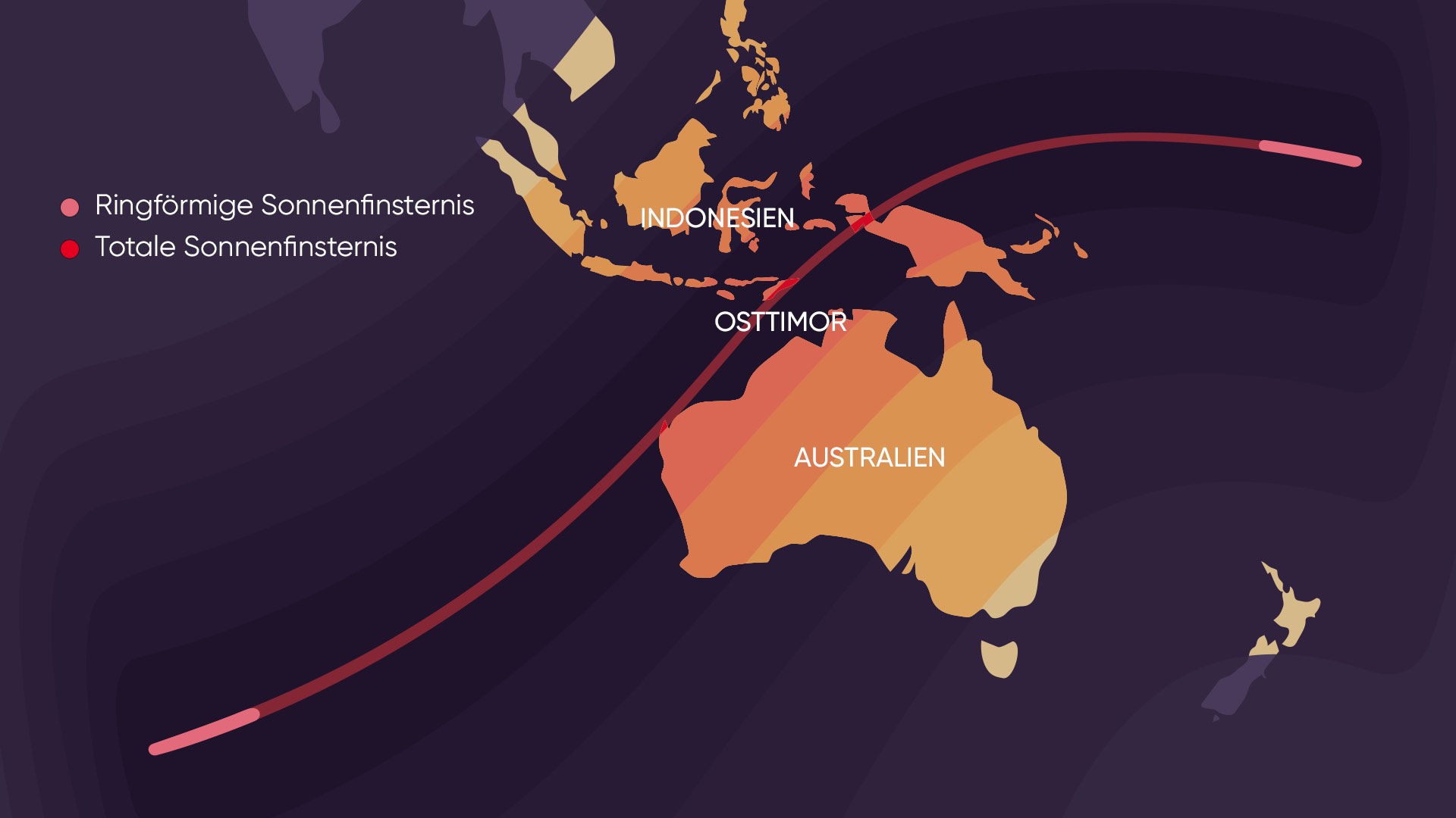 Die totale Phase der Sonnenfinsternis wird im Osten Osttimors, in Teilen Westpapuas und auf der Halbinsel Exmouth in Westaustralien zu sehen sein.