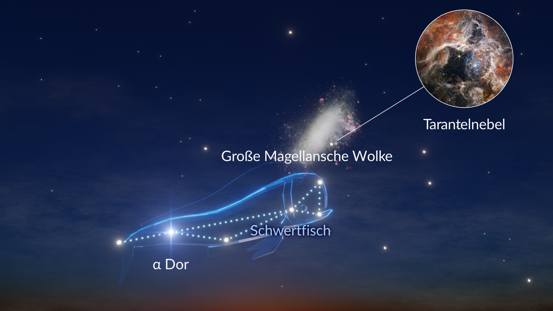 Dorado (Schwertfisch) ist ein lichtschwaches Sternbild der Südhalbkugel. Sein hellster Stern, Alpha Doradus (3,3 mag), ist nur unter einem dunklen Himmel mit geringer Lichtverschmutzung mit bloßem Auge gut erkennbar. Der Schwertfisch beherbergt einen Großteil der Großen Magellanschen Wolke (LMC) – das herausragende Objekt dieser Region. Die LMC lässt sich ohne optische Hilfsmittel beobachten, aber ein Fernglas oder Teleskop offenbart weit mehr ihrer Sternhaufen und Nebel, einschließlich des Tarantelnebels (30 Doradus).
