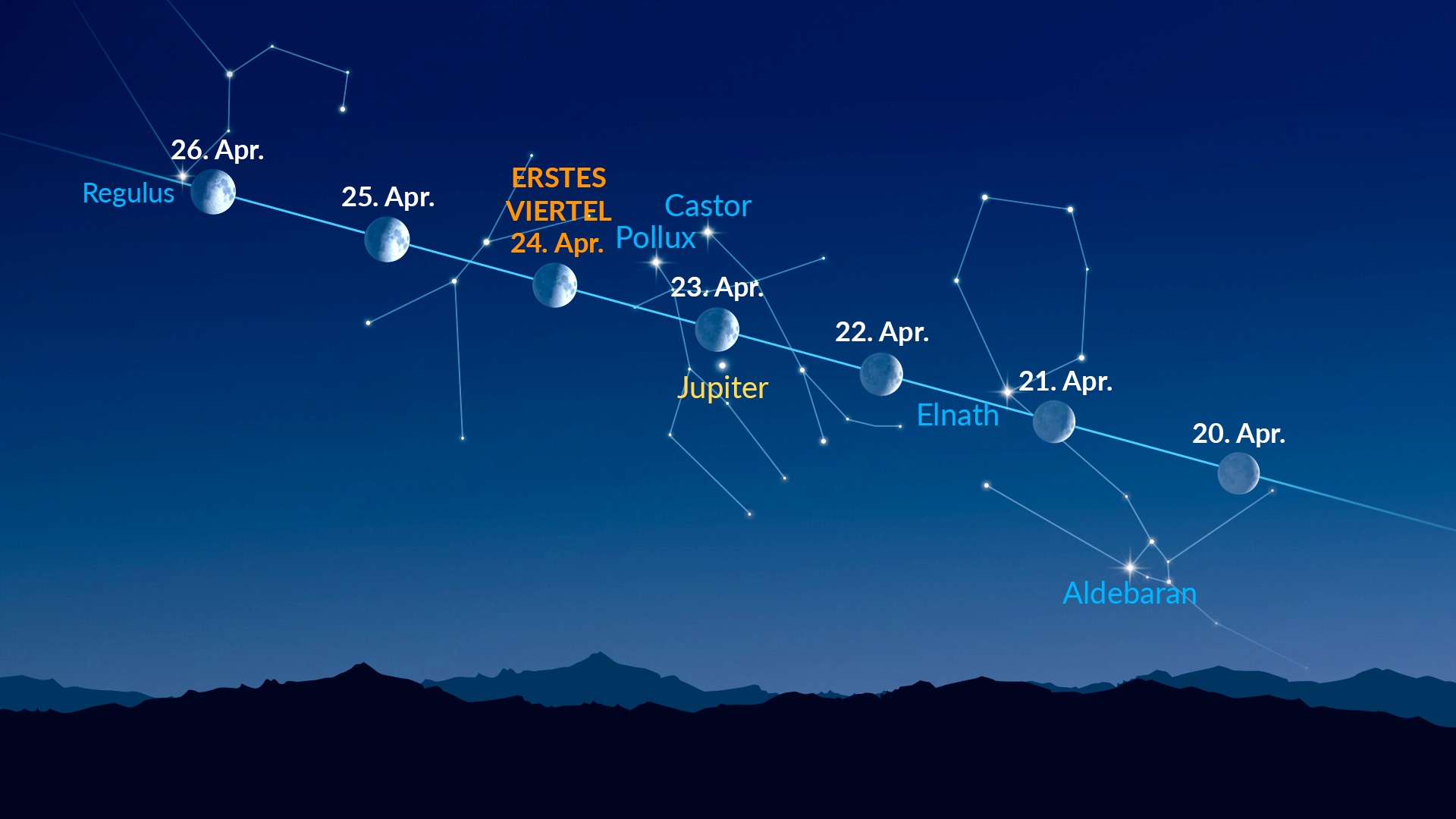 Vom 20. bis 26. April 2026 zieht der Mond durch die Sternbilder Stier, Zwillinge, Krebs und Löwe.