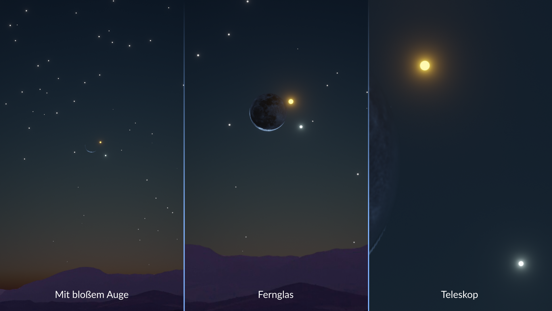 - Ein Teleskop bietet die detaillierteste Sicht auf die Bedeckung und zeigt die genauen Momente, in denen Venus am Mondrand verschwindet und wieder erscheint.