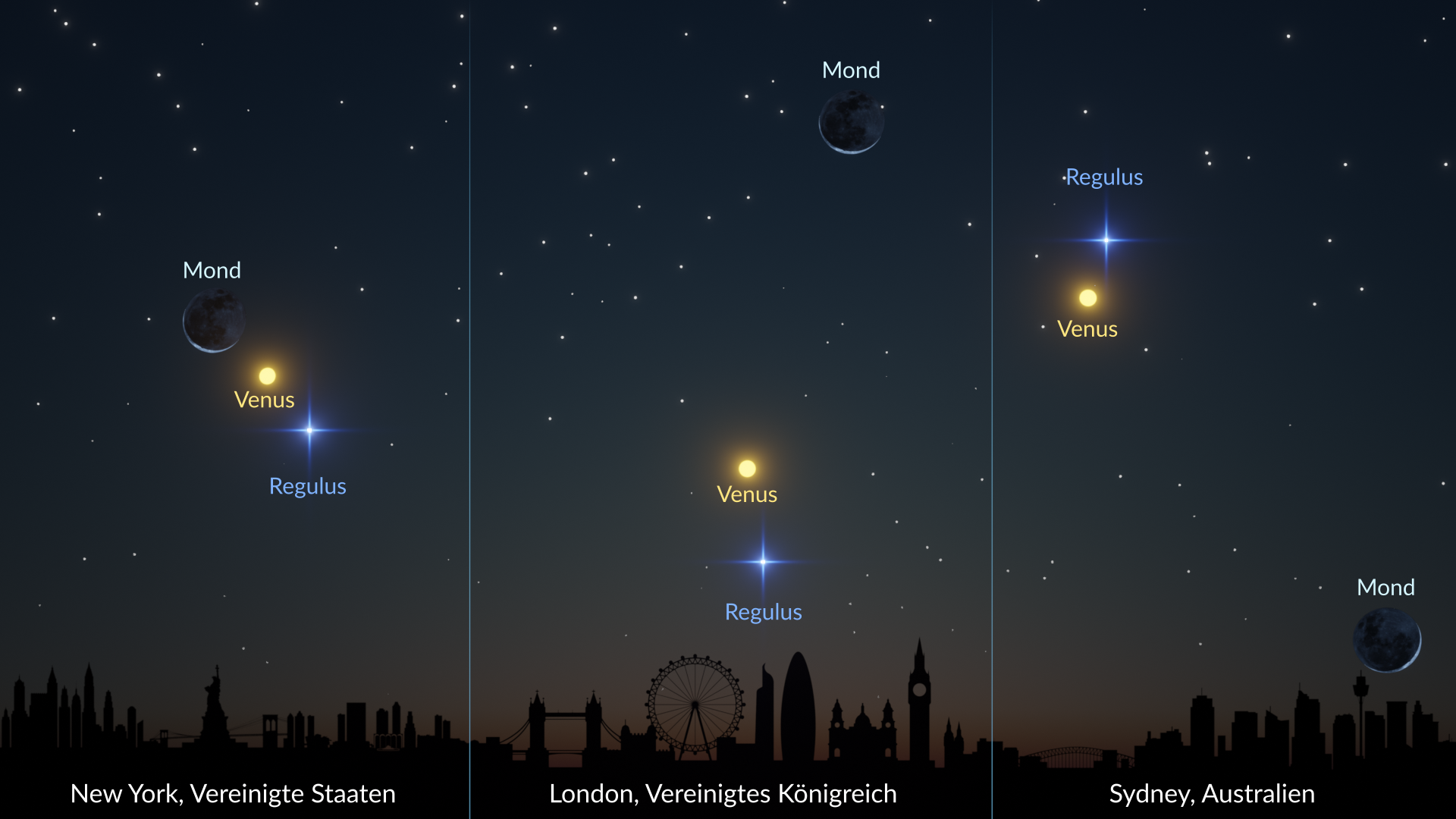 Die genaue Konstellation der drei Objekte variiert je nach Standort, da sich die scheinbare Position des Mondes von verschiedenen Punkten der Erde aus betrachtet geringfügig verschiebt. Beobachter in New York, USA, sehen beispielsweise alle drei Objekte dicht gruppiert innerhalb eines Sichtfelds von einem Grad – so nah, dass man sie mit ausgestrecktem Arm mit dem Finger bedecken könnte. In Sydney, Australien, erscheinen sie dagegen weiter auseinander und erreichen eine Trennung von etwa 4 Grad.
