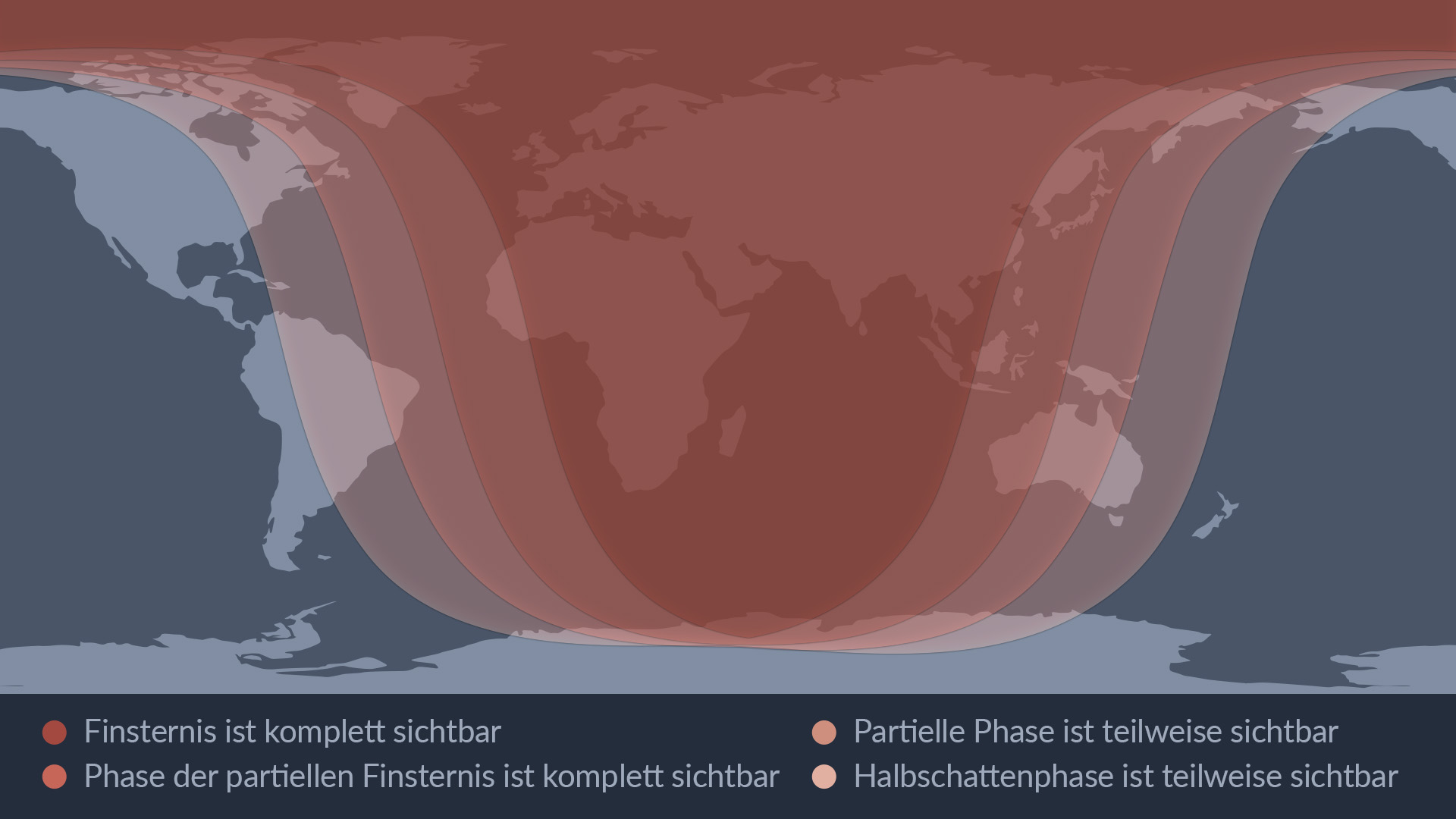 Zumindest ein Teil der Mondfinsternis wird von Europa, Asien, Australien, Afrika, Nordamerika, einem großen Teil Südamerikas, dem Pazifik, dem Atlantik, dem Indischen Ozean, der Arktis und der Antarktis aus sichtbar sein.