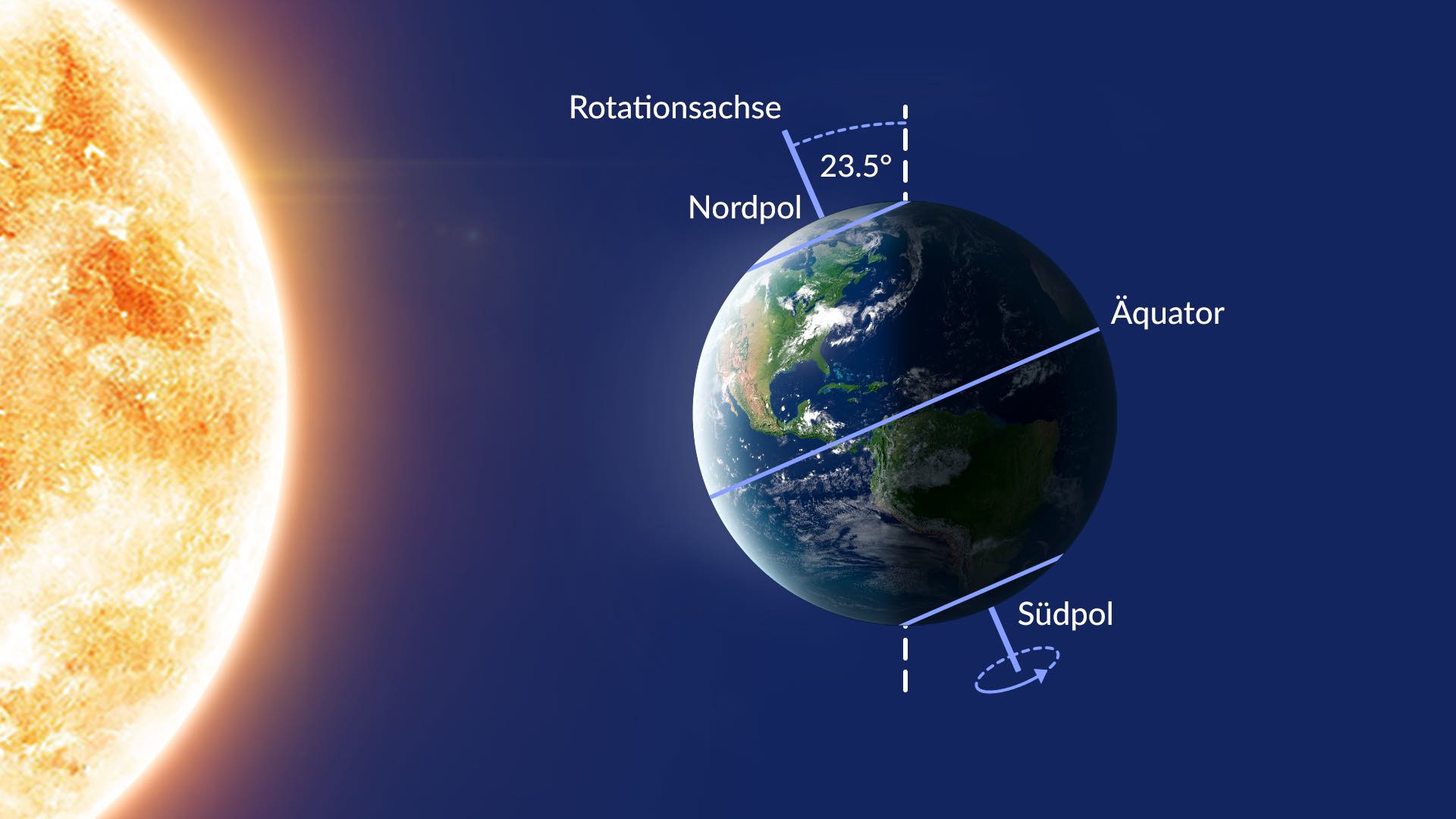 Diese Achse steht nicht senkrecht zur Erdbahnebene, sondern ist um etwa 23,5° geneigt. Deshalb neigen sich Nord- und Südpol das ganze Jahr über in unterschiedlichen Winkeln zur Sonne (wenn Sie sich diese Bewegung nicht vorstellen können, sehen Sie sich dieses Video an).