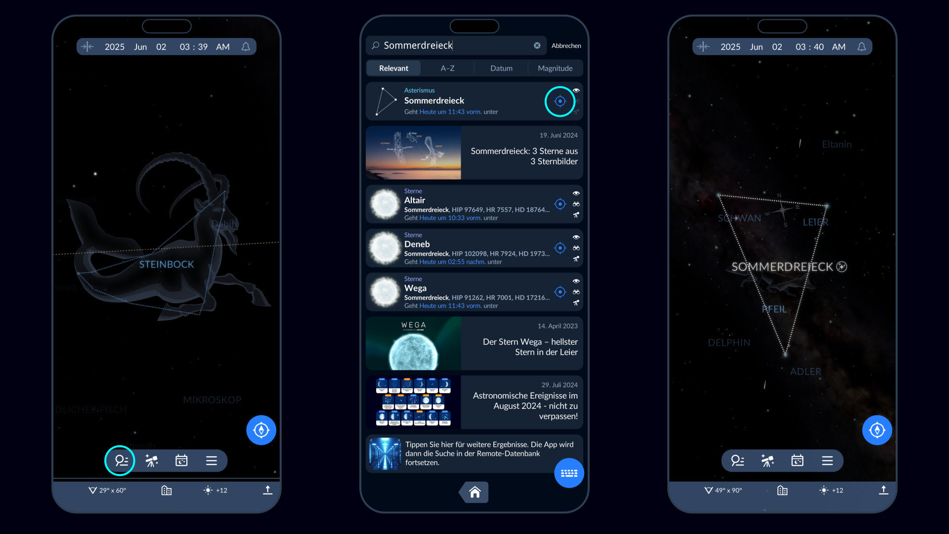 Das ist es! Verbinden Sie diese drei Punkte und Sie werden das Sommerdreieck erblicken. Um zu überprüfen, ob Sie es richtig erkannt haben, öffnen Sie die Sky Tonight App und gehen Sie zum Suchfenster. Geben Sie „Sommerdreieck“ in die Suchleiste ein und tippen Sie auf das blaue Zielsymbol daneben, sobald das entsprechende Ergebnis angezeigt wird. Die App zeigt Ihnen die Position des Sommerdreiecks am Himmel. Richten Sie Ihr Gerät auf den Himmel – die App zeigt Ihnen die Sternenkarte live und verfolgt Ihre Bewegungen.