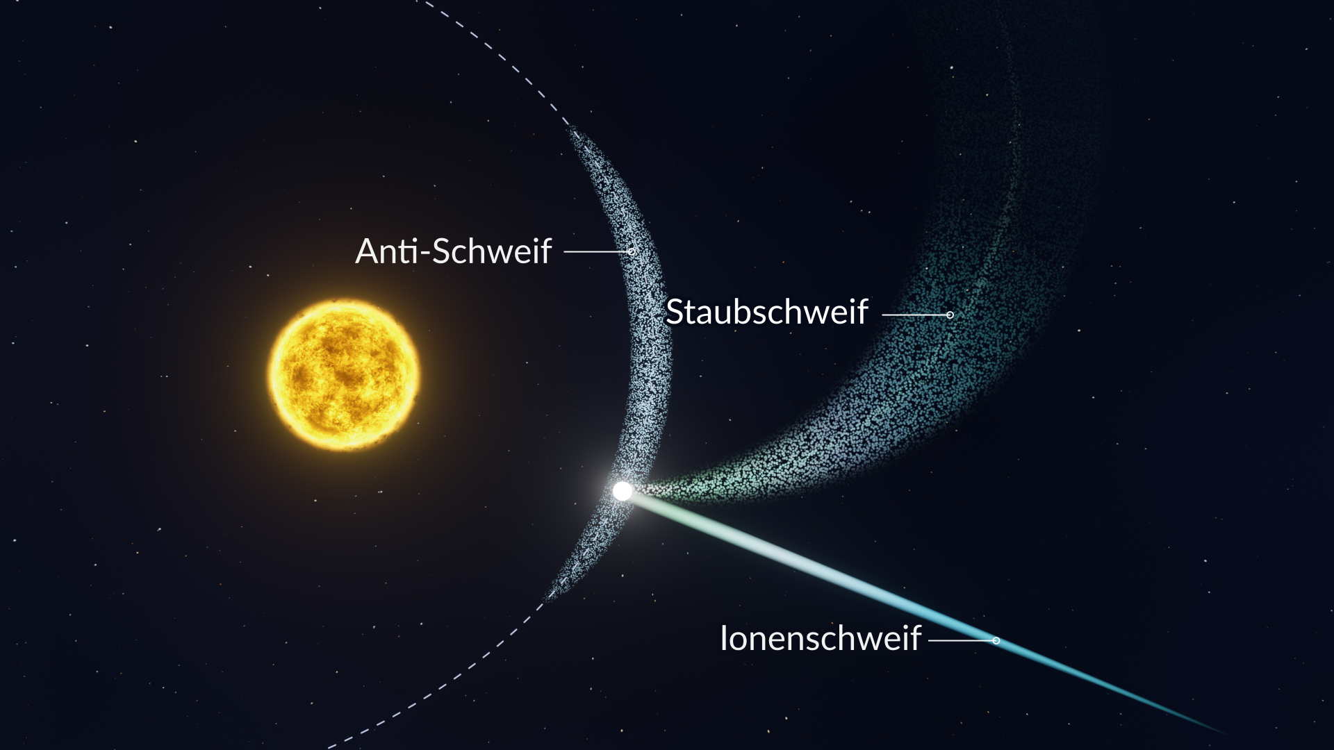 Wenn sich ein Komet im inneren Sonnensystem befindet, wird er von der Sonne aufgeheizt, wodurch sein Eis verdampft und Staub- und Gasteilchen freigesetzt werden. Der Sonnenwind bläst diese Partikel vom Kometen weg und wir sehen den Staub und die Ionenschweife.