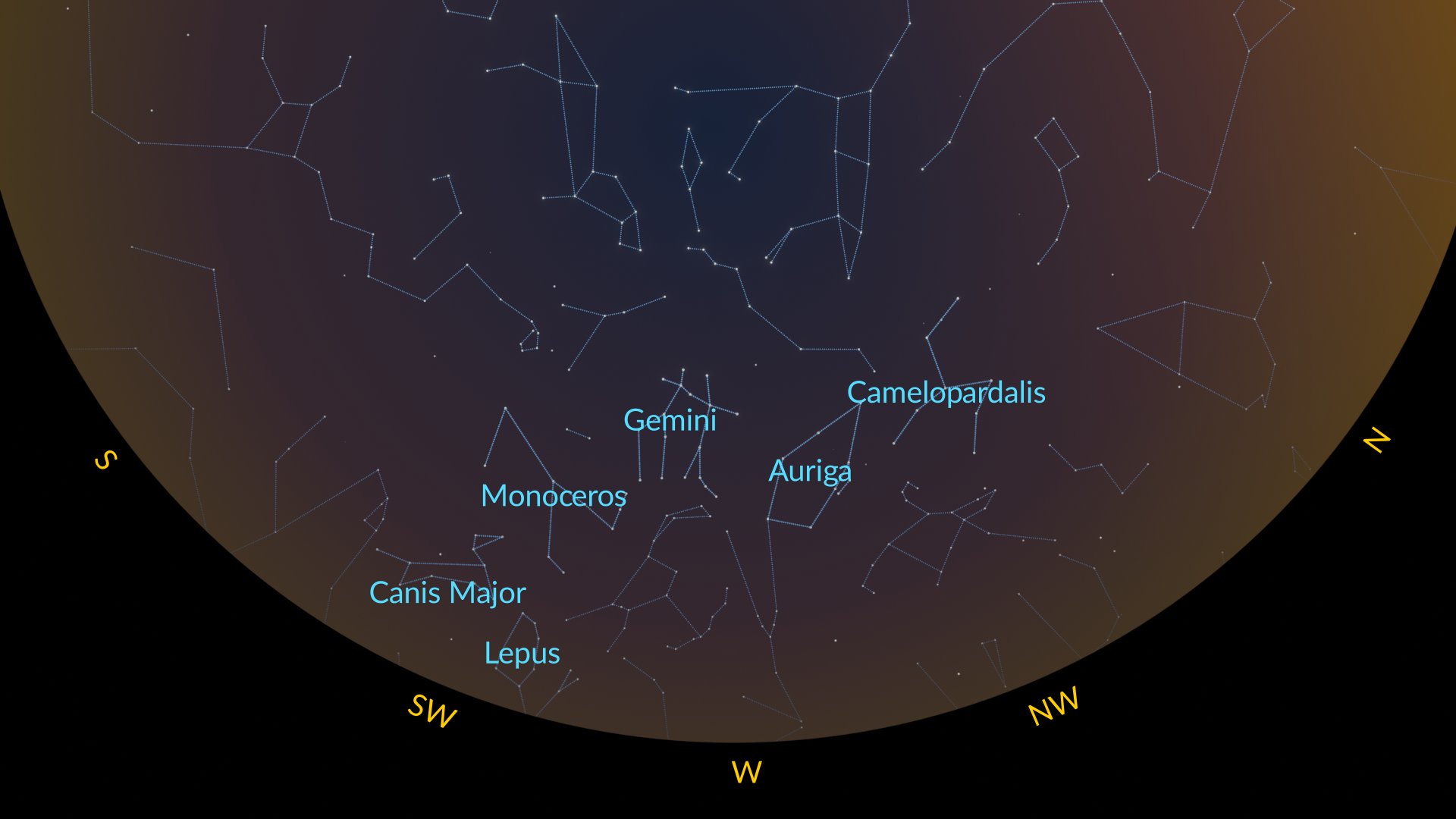 In the northern sky, look for bright patterns such as Canis Major, Auriga, and Gemini, along with fainter constellations like Lepus, Monoceros, and Camelopardalis.