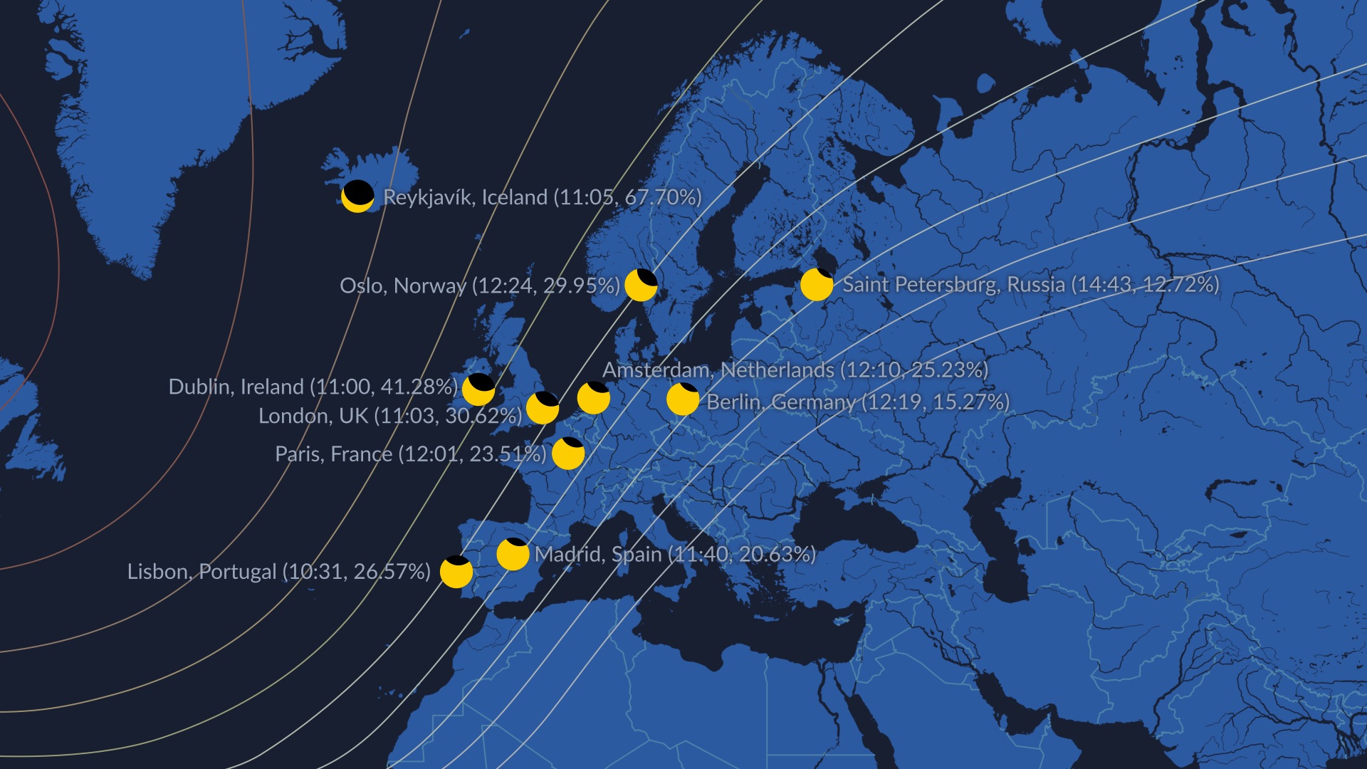 In Europe, the timing of the eclipse is more favorable, so many locations will be able to see its maximum. The farther northwest you go, the bigger portion of the Sun will be covered by the Moon. This makes countries like Iceland, Ireland, and the United Kingdom some of the best places in Europe to observe the eclipse.