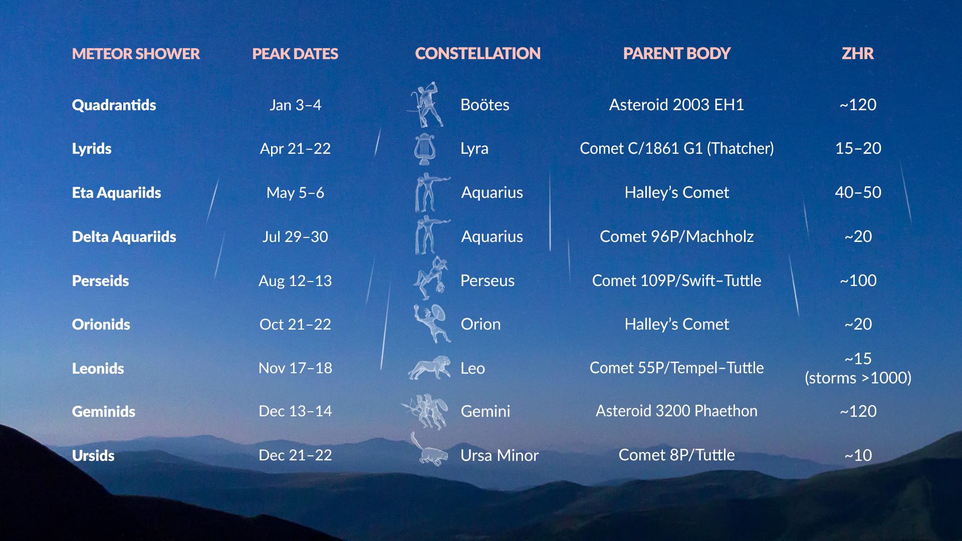 Every year, Earth crosses several well-known streams of cometary or asteroidal debris, producing reliable meteor showers. Their activity periods, peak nights, and intensities vary, but each has a characteristic radiant (apparent origin point in the sky) and a known parent body. The ZHR (zenithal hourly rate) indicates the maximum number of meteors per hour visible under ideal dark-sky conditions when the radiant is overhead. In practice, the observed number is usually lower, and visibility also depends on whether the shower favors the Northern or Southern Hemisphere.