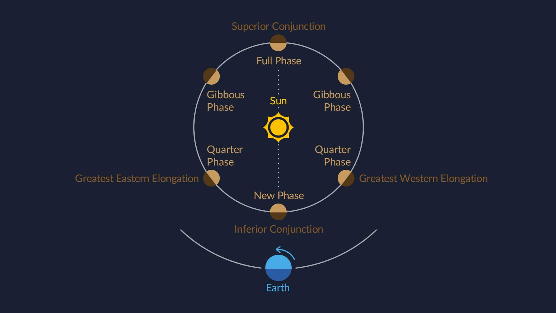 As shown in the image above, inferior planets go through a full cycle of phases: from new phase at inferior conjunction to quarter phases near greatest elongations and full phase at superior conjunction. However, observing the full and new phases is extremely challenging because during these phases the planets are lost in the Sun's glare. Thus, the visible phases range from crescent to gibbous.