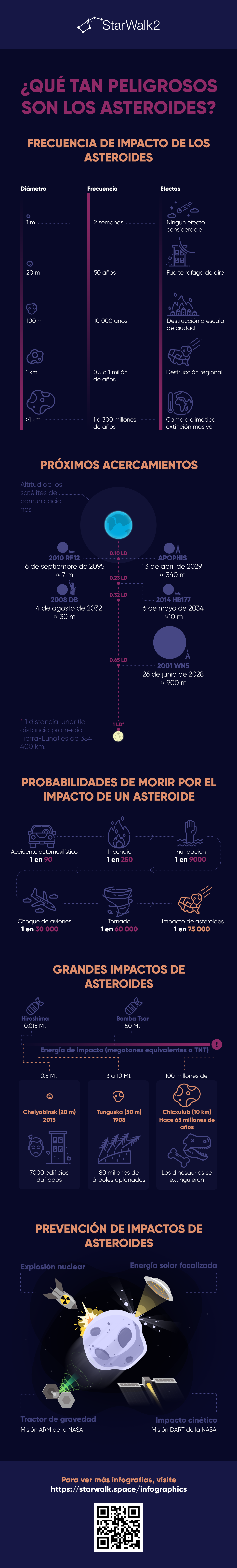 Mucha gente se pregunta qué pasaría si un asteroide chocara contra la Tierra. Bueno, hay pequeños asteroides que golpean la Tierra cada dos semanas, y no pasa nada especial. Pero, ¿y si fuera un asteroide gigante? Usa nuestra infografía para conocer cómo los asteroides pueden impactar la Tierra dependiendo de su tamaño y qué se puede hacer para evitar la colisión de asteroides. Si te gusta, ¡no dudes en compartir esta infografía con tus amigos! También está disponible en nuestra cuenta de Instagram a través del hashtag #infographics_StarWalk. ¡Síguenos en Instagram para obtener más información sobre el espacio!