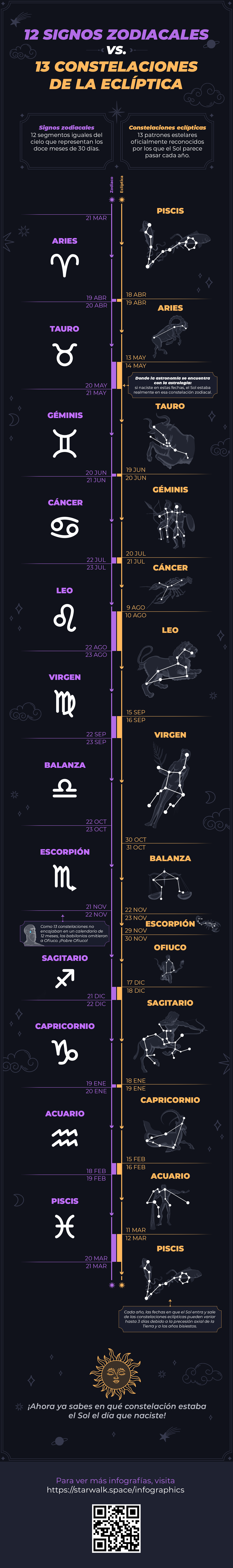 Además, con el tiempo, los límites de los patrones estelares reales (las constelaciones zodiacales) que más o menos coinciden con los signos zodiacales tradicionales han cambiado. Por eso, las fechas del paso del Sol por ellas difieren notablemente de las fechas astrológicas. En esta infografía, verás cómo se compara el zodiaco antiguo con las constelaciones actuales de la eclíptica y descubrirás dónde estaba el Sol cuando naciste. Para profundizar en si hay ciencia detrás de tu signo zodiacal, consulta nuestro artículo dedicado.
