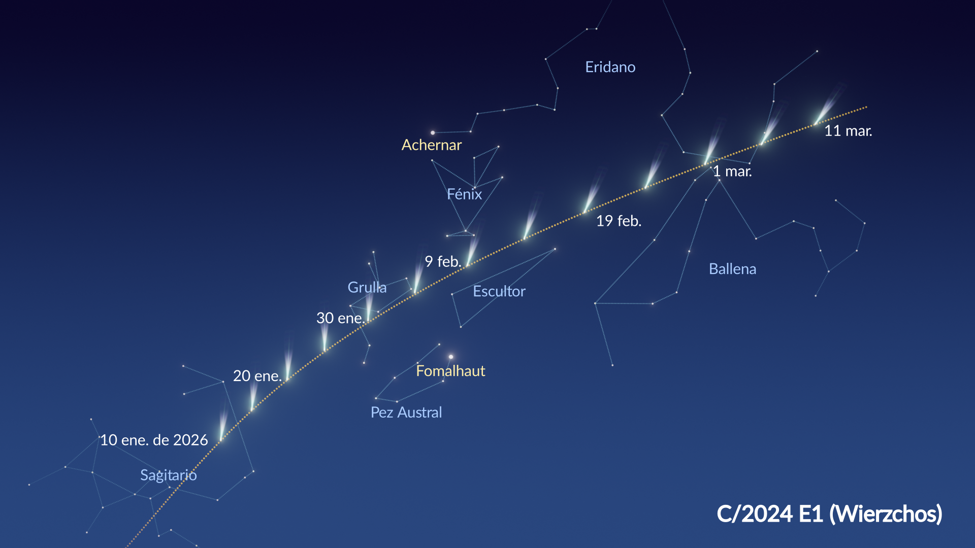 - 17 de febrero: C/2024 E1 (Wierzchos) alcanza su mayor aproximación a la Tierra ⭐