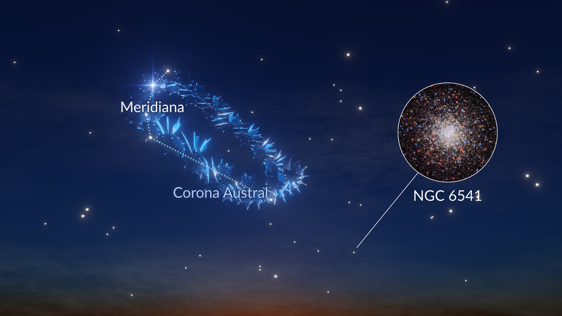 Corona Australis aparece como un arco curvado de estrellas tenues que realmente parece una corona. Solo se puede ver bajo cielos oscuros.