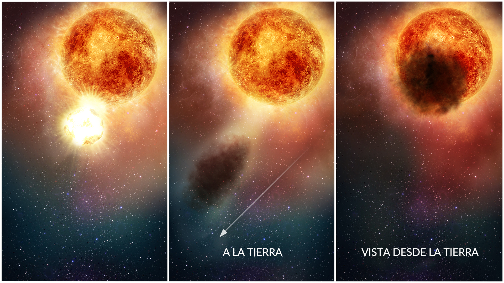 Todo el revuelo sobre que Betelgeuse se convertiría en supernova comenzó en 2019, cuando la estrella de repente bajó hasta aproximadamente el 40% de su brillo habitual antes de volver gradualmente a la normalidad a comienzos de 2020. Al principio, muchos creyeron que Betelgeuse estaba a punto de explotar, pero esta teoría se ha demostrado falsa. Resultó que el efecto de atenuación se debió simplemente a una nube de polvo, así que la caída de brillo de Betelgeuse no se debió a cambios dentro de la propia estrella. La estrella solo parecía más tenue porque la observábamos a través de una nube de polvo expulsada por la estrella.