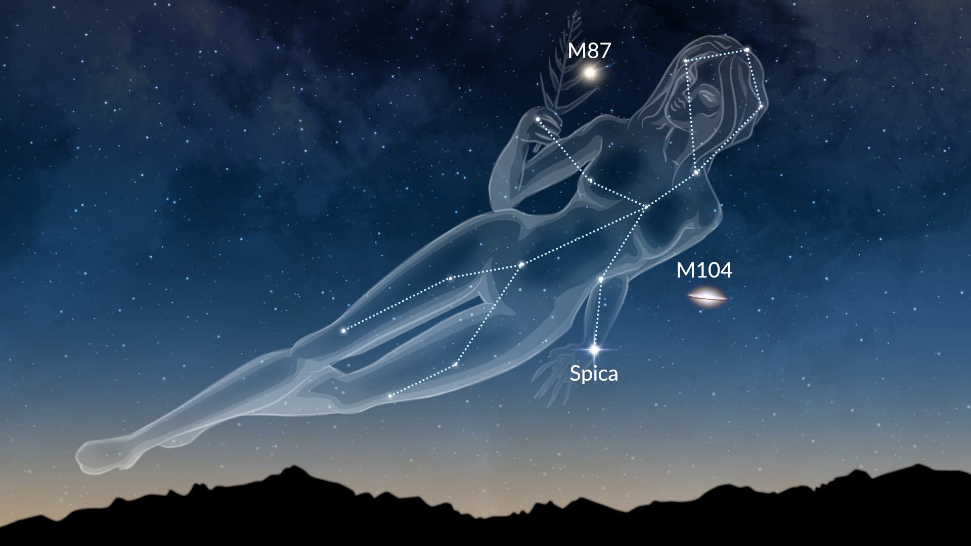 Virgo es la segunda constelación más grande del cielo y es conocida por su brillante estrella Spica. También destaca por albergar muchos objetos Messier, entre ellos la radiogalaxia Virgo A (M87) y la galaxia del Sombrero (M104), que son excelentes objetivos para telescopio. Para obtener la lista completa, abre Sky Tonight, busca la constelación de Virgo y pulsa su nombre. En la pestaña «Info», pulsa el botón «+More» debajo de la imagen. Verás la lista de objetos relacionados con la constelación de Virgo. Pulsa el icono azul del objetivo junto al objeto para ver su posición en el cielo.