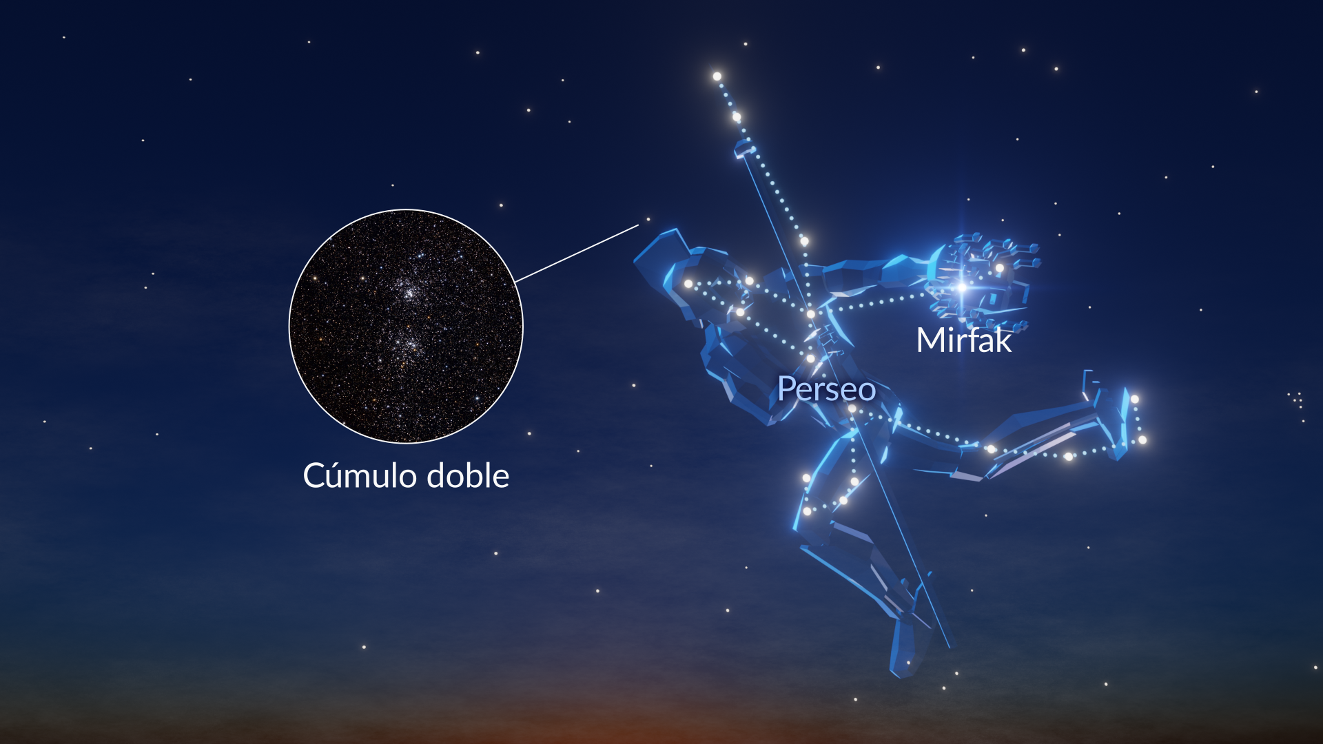 En el hemisferio norte, Perseus se encuentra alto en el cielo durante las noches de diciembre. Primero, mira hacia arriba y encuentra la forma de “W” de Cassiopeia. Luego dirige la vista hacia el este, hacia la estrella brillante Capella (mag 0.1) en Auriga. Al suroeste de Capella verás las Pléyades, un cúmulo estelar compacto y azulado. Si imaginas un triángulo que conecta Cassiopeia, Capella y las Pléyades, Perseus se encuentra dentro de él.