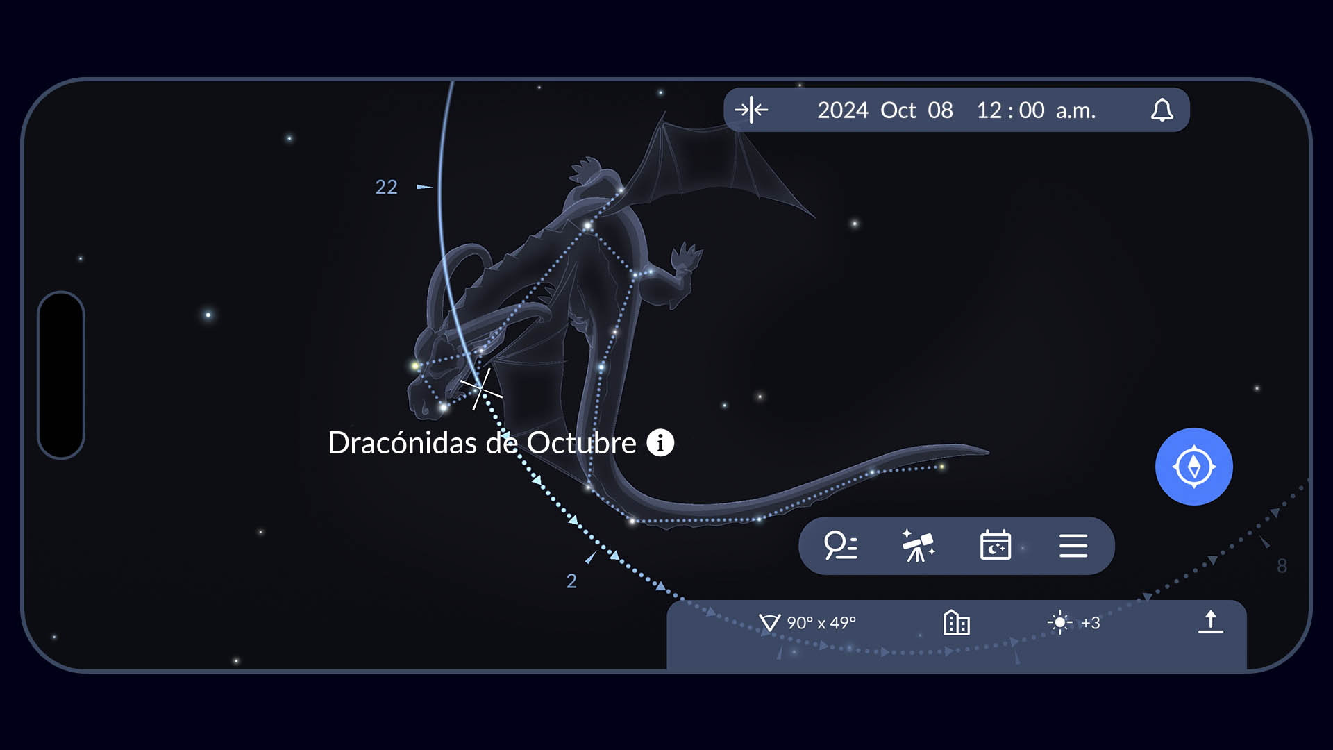 - Para localizar el radiante de las Dracónidas sobre ti, toca el botón azul de la brújula o apunta tu dispositivo hacia el cielo. Una flecha blanca te guiará hacia la posición del radiante. Mueve tu dispositivo siguiendo la flecha hasta que veas el radiante de las Dracónidas en la pantalla. La imagen corresponde al cielo real en tu ubicación.