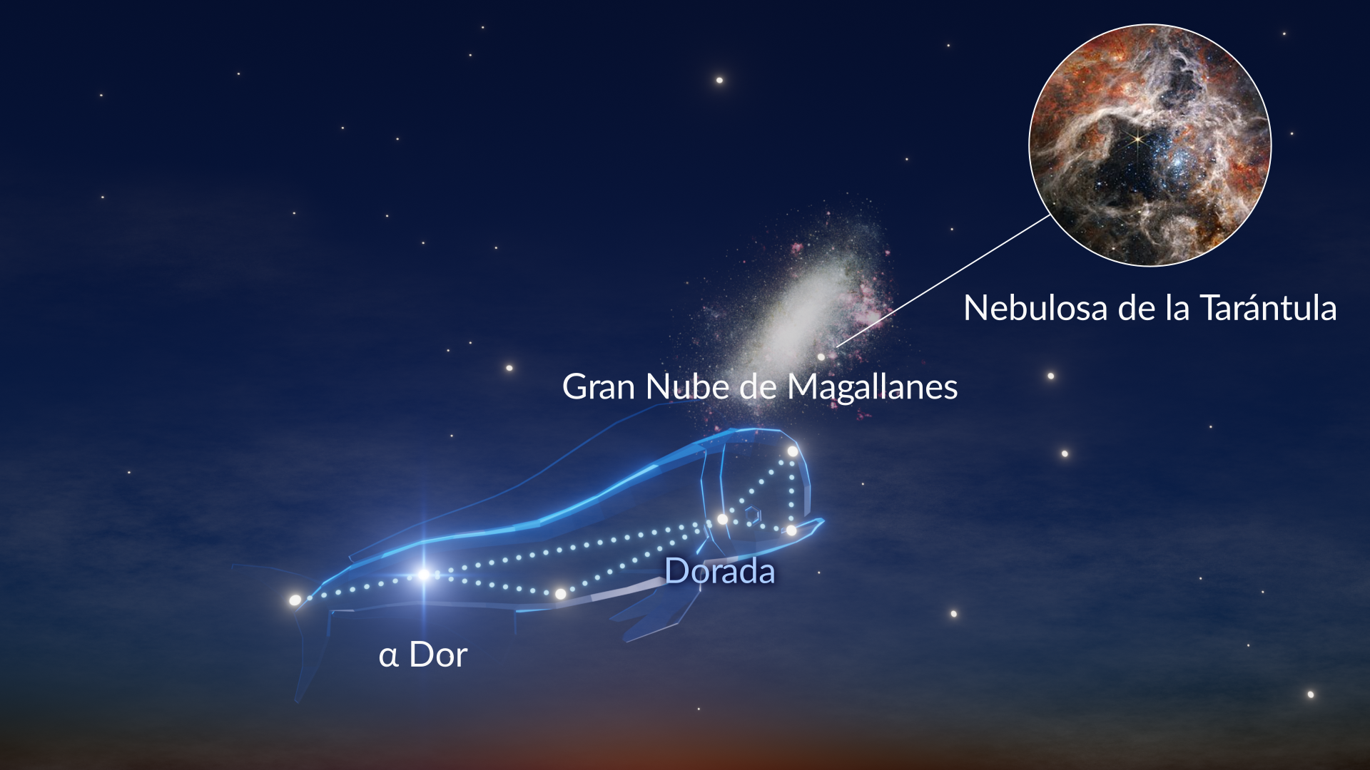 Dorado es una constelación tenue del hemisferio sur. Su estrella más brillante, Alfa Doradus (mag 3,3), se aprecia a simple vista solo bajo cielos oscuros y con poca contaminación lumínica. Dorado contiene gran parte de la Gran Nube de Magallanes (LMC), el objeto más destacado de esta región. La LMC puede verse sin instrumentos ópticos, pero unos prismáticos o un telescopio revelan muchos más de sus cúmulos estelares y nebulosas, incluida la Nebulosa de la Tarántula (30 Doradus).