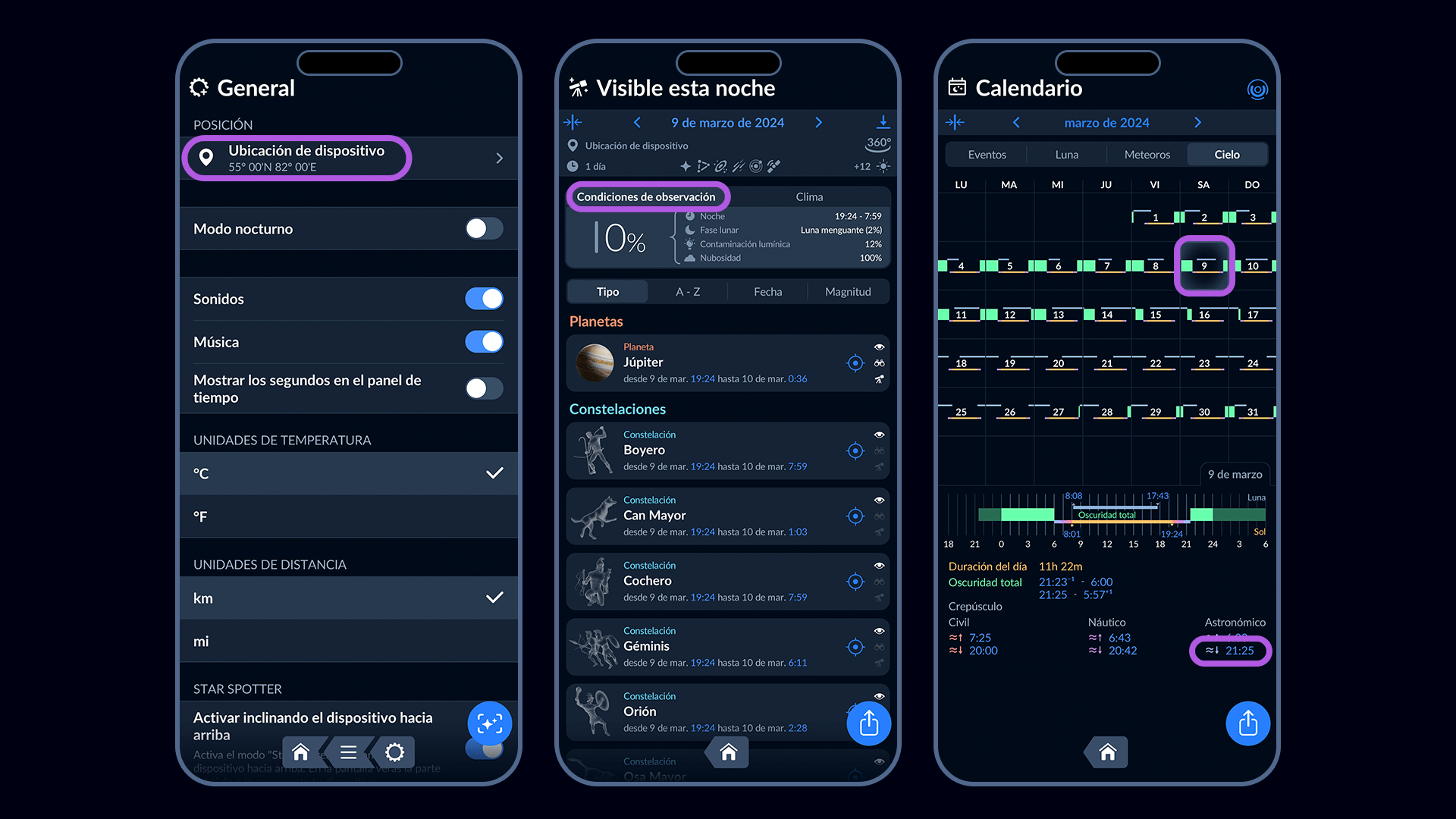 - Averigua cuándo comienza el crepúsculo astronómico en tu área. Ve a la función de Calendario, selecciona la pestaña Sky, y busca la hora de inicio del crepúsculo astronómico para la fecha deseada. Es el momento en el que debes estar listo para observar.