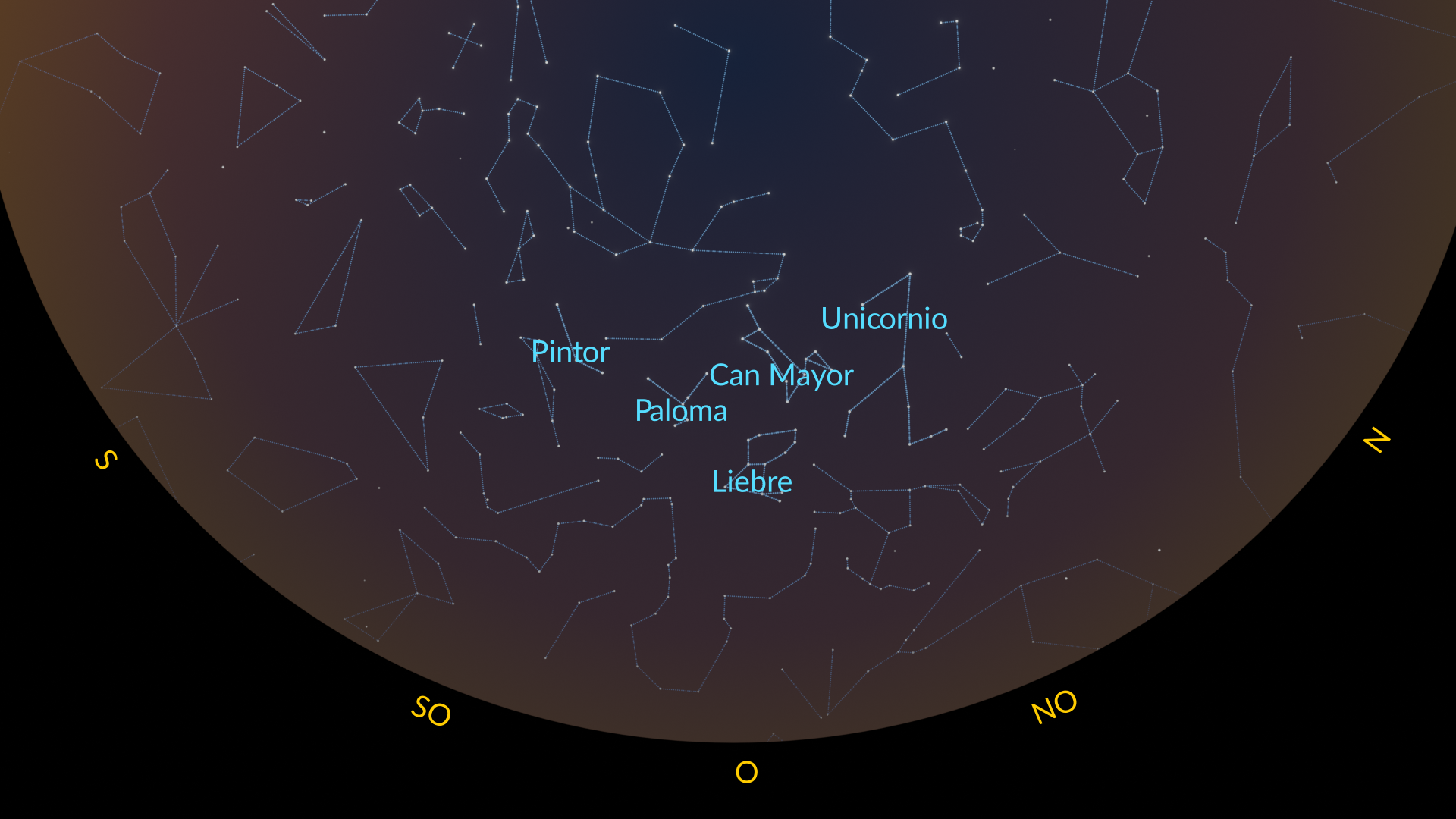 En el cielo del norte, busca patrones brillantes como Can Mayor, Auriga y Géminis, junto con constelaciones más tenues como La Liebre, El Unicornio y La Jirafa.