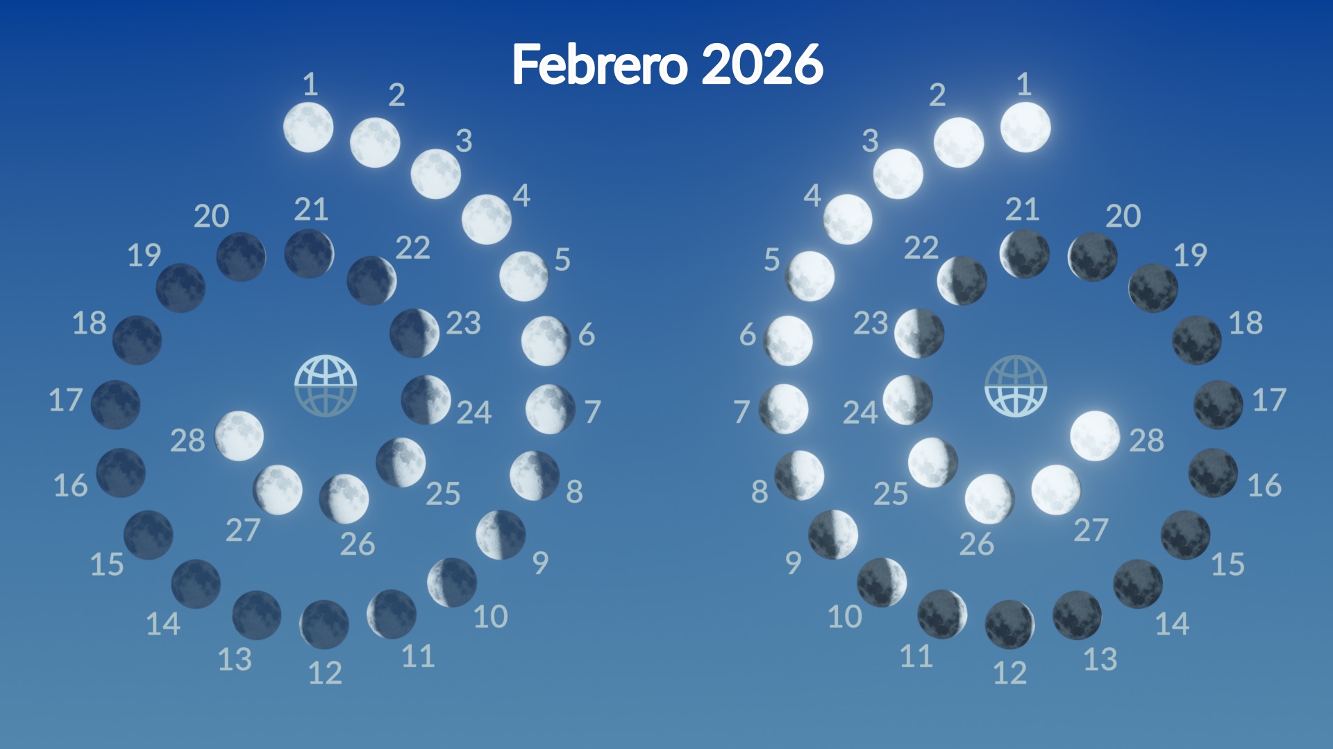 Aquí tienes un vistazo a las fases de la Luna en febrero de 2026 y a los eventos clave asociados con ellas. También puedes consultar la fase lunar actual y encontrar las horas de salida y puesta de la Luna para cualquier día usando nuestro Calendario lunar.