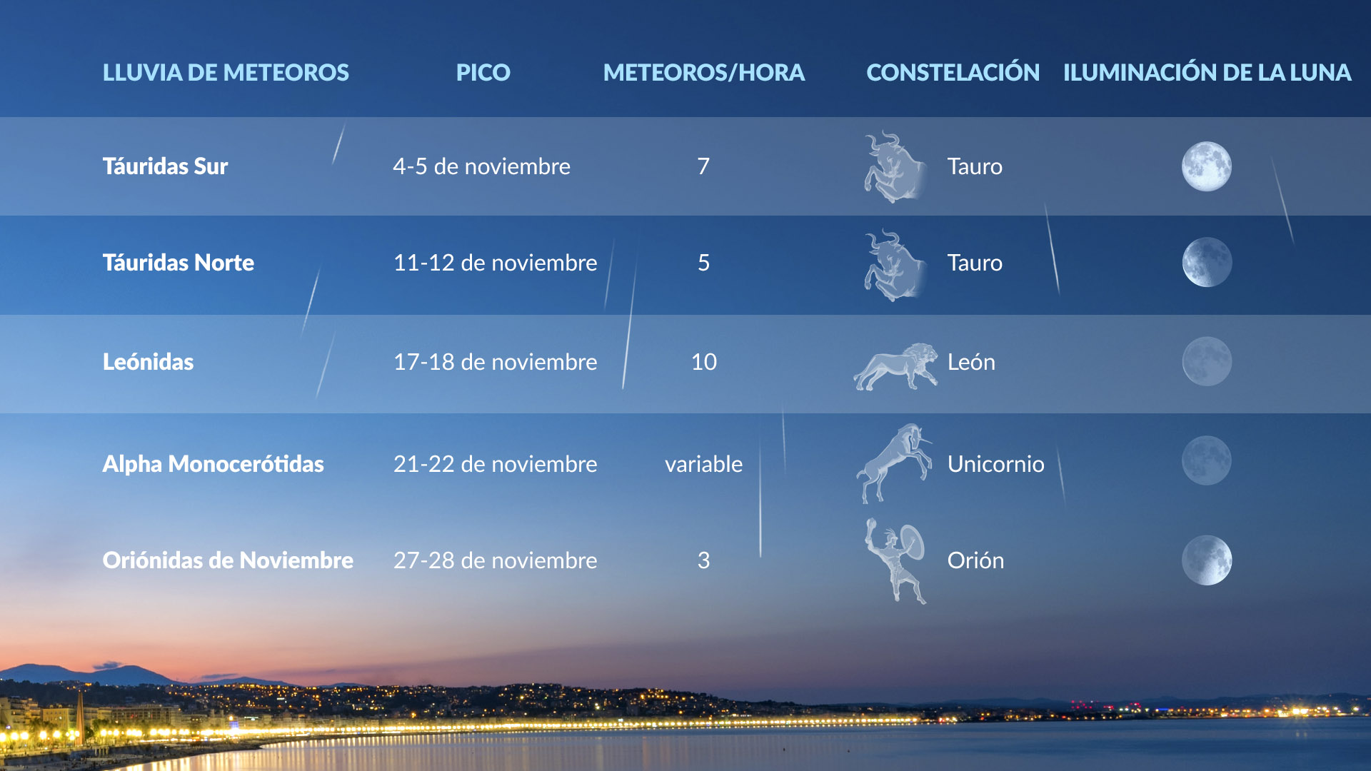 Cinco lluvias de meteoros alcanzarán su pico este mes. Son las Táuridas del Sur, Táuridas del Norte, Leónidas, Alfa Monocerótidas y Oriónidas de noviembre, siendo las Leónidas la más prolífica.