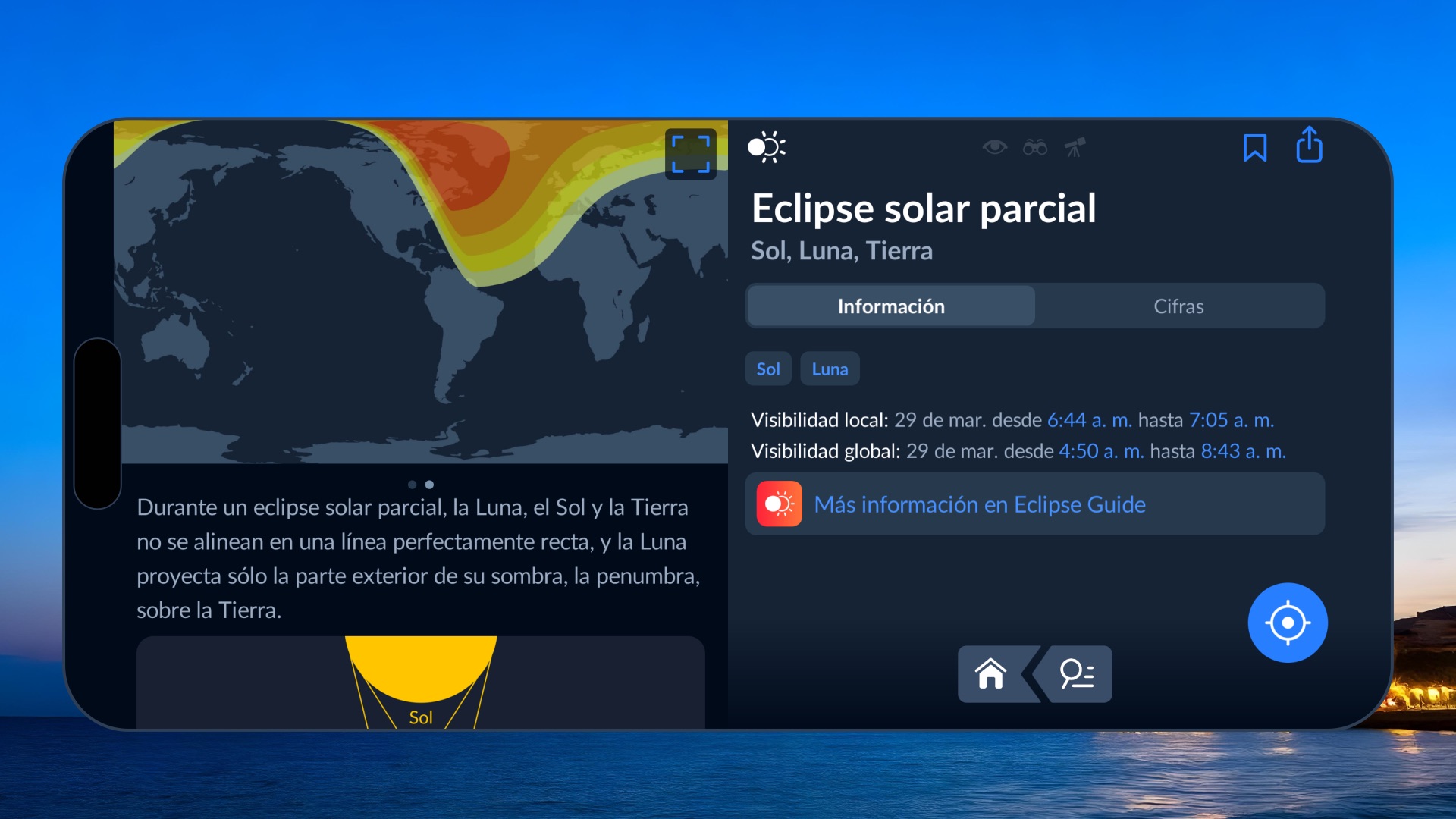 Otra gran herramienta para el seguimiento de eclipses es la app Sky Tonight. Abre la app y toca el ícono Calendar en la parte inferior de la pantalla principal. Localiza el 29 de marzo y selecciona el evento Partial Solar Eclipse. Desliza hacia la izquierda en la imagen del evento para acceder al mapa del eclipse. Para expandir el mapa, toca el ícono azul en la esquina superior derecha. Luego puedes arrastrar el mapa hacia la izquierda y derecha para explorar diferentes ubicaciones. Toca el botón “i” para ver la leyenda del mapa y comprender qué representa cada sección de color.