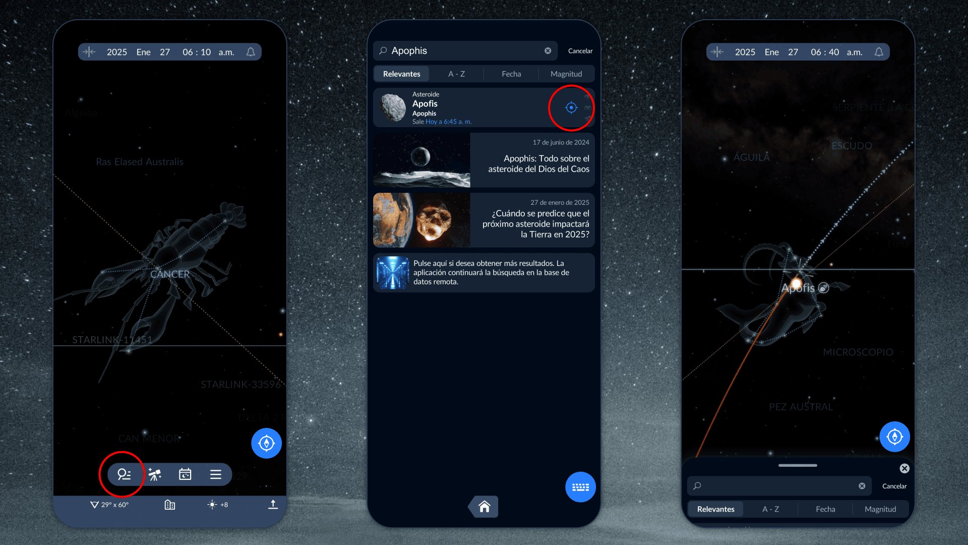Puedes seguir la posición de un asteroide en el cielo con la app Sky Tonight. Toca el icono de la lupa y escribe su nombre en la barra de búsqueda. Cuando el asteroide aparezca en los resultados de búsqueda, toca el icono azul de objetivo junto a su nombre. Sky Tonight te mostrará la ubicación actual del asteroide en el cielo.