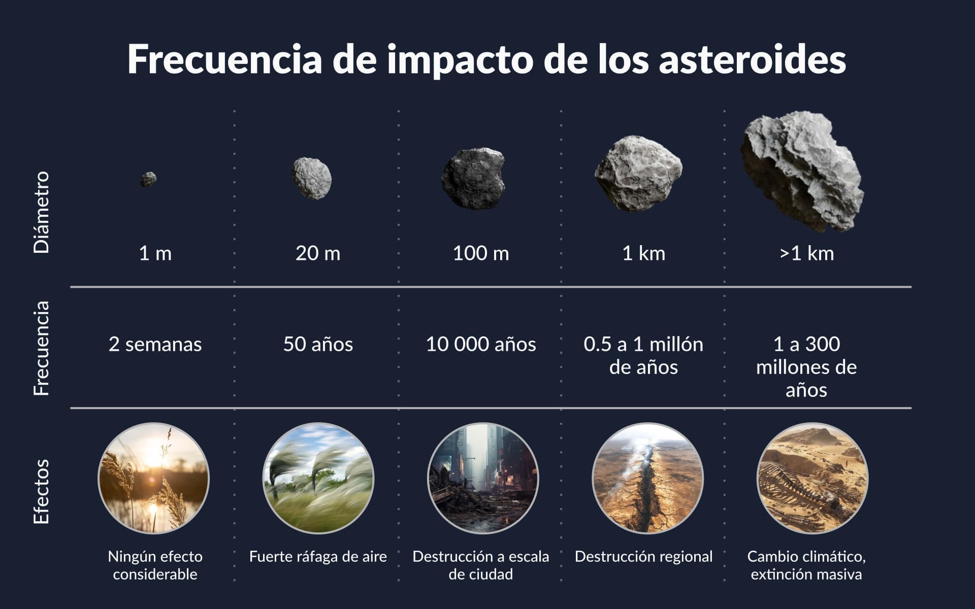 Puedes sacar tus propias conclusiones. Incluso rocas espaciales relativamente pequeñas, como el meteorito de Cheliábinsk, pueden causar daños locales. Los asteroides de más de 1 kilómetro pueden tener efectos globales, como provocar un cambio climático prolongado. Para entenderlo mejor visualmente, consulta nuestra infografía, en la que comparamos el tamaño de los asteroides con las posibles consecuencias del impacto.