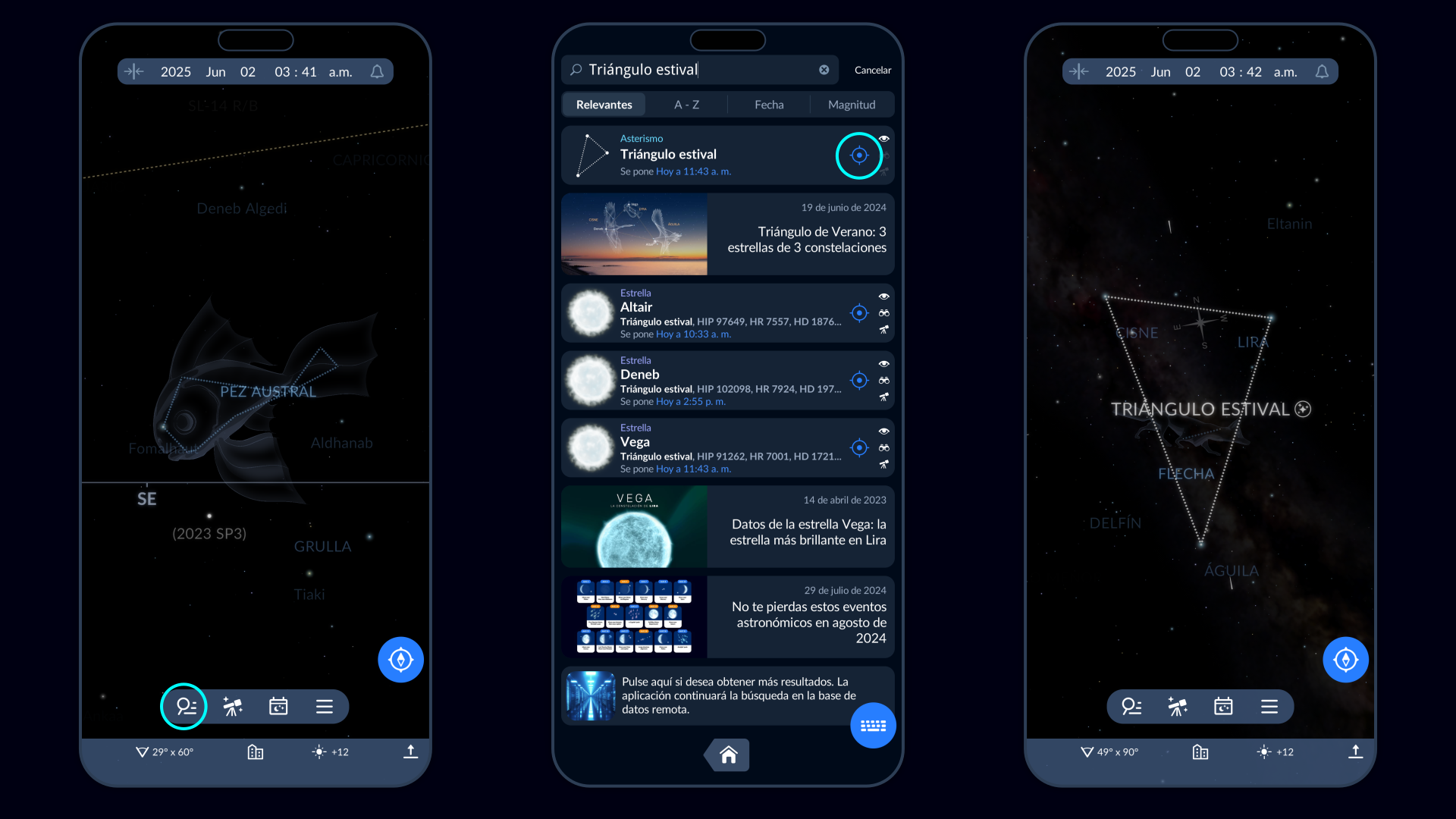 ¡Eso es todo! Conecta estos tres puntos y obtendrás el Triángulo de Verano. Para confirmar que lo identificaste correctamente, abre la aplicación Sky Tonight, ve a la ventana de búsqueda y comienza a escribir "Summer Triangle". Cuando aparezca el resultado correspondiente, pulsa en el ícono azul de destino junto al resultado. La aplicación te mostrará la ubicación del Triángulo de Verano en tu cielo. Apunta tu dispositivo hacia el cielo: la app te mostrará el mapa estelar en tiempo real y seguirá tus movimientos.