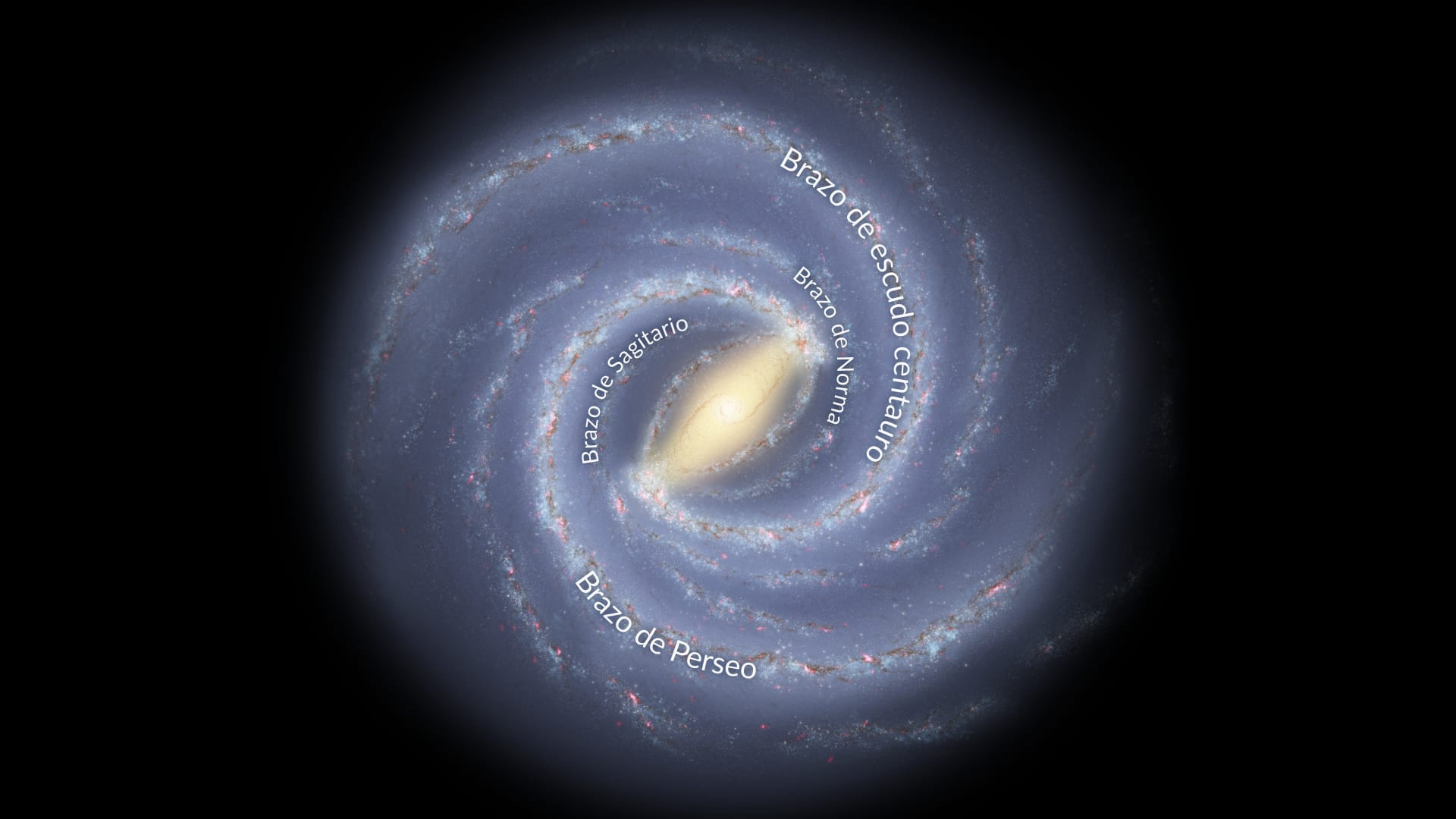Para ser más específicos, la Vía Láctea es una galaxia espiral barrada, que significa que tiene una estructura central en forma de barra recta compuesta de estrellas. Esta barra contiene el núcleo de la galaxia en el centro y tiene dos brazos en espiral, uno en cada extremo. Si la Vía Láctea fuera una galaxia espiral normal, sus brazos llegarían realmente hasta el centro (o núcleo) igual que en la galaxia Andrómeda.