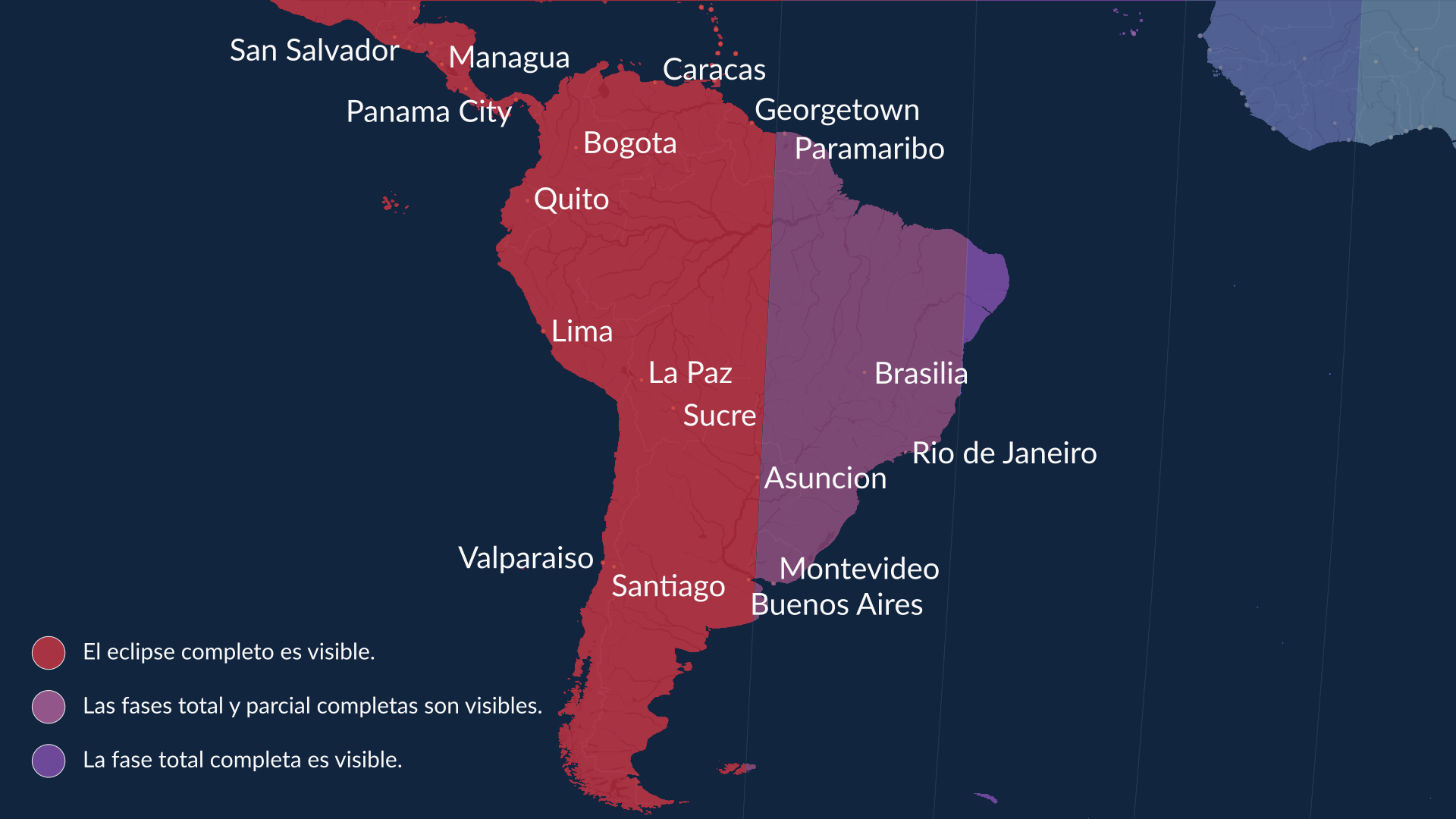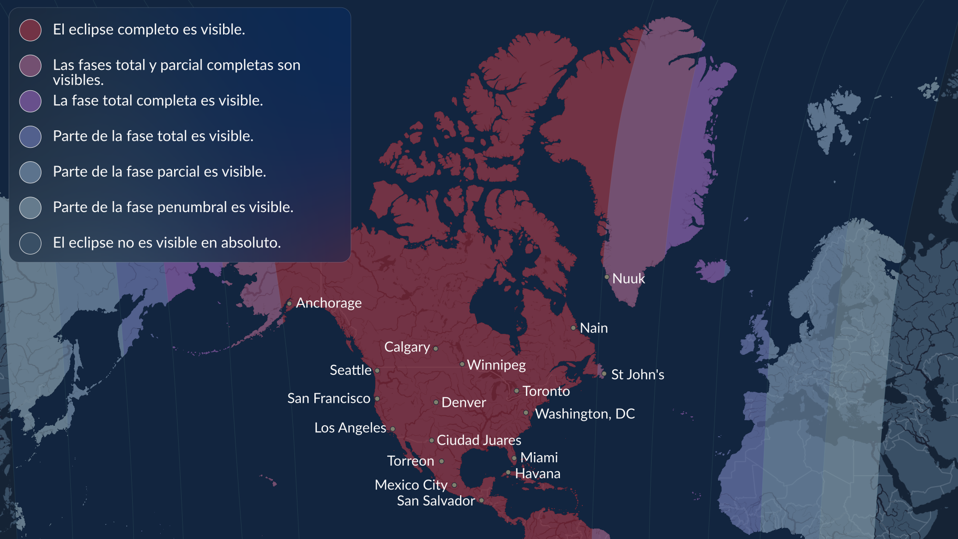 - Todo el eclipse será visible en Norte y Sudamérica, Europa Occidental y África Occidental.