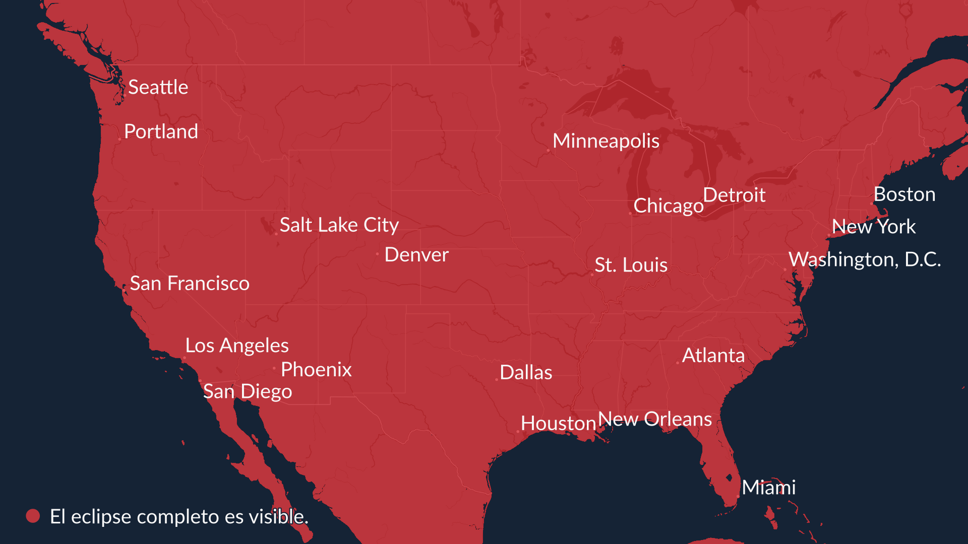 Algunas ubicaciones verán todo el eclipse total, mientras que otras verán solo una parte, ya que la Luna saldrá más tarde o se pondrá más temprano: