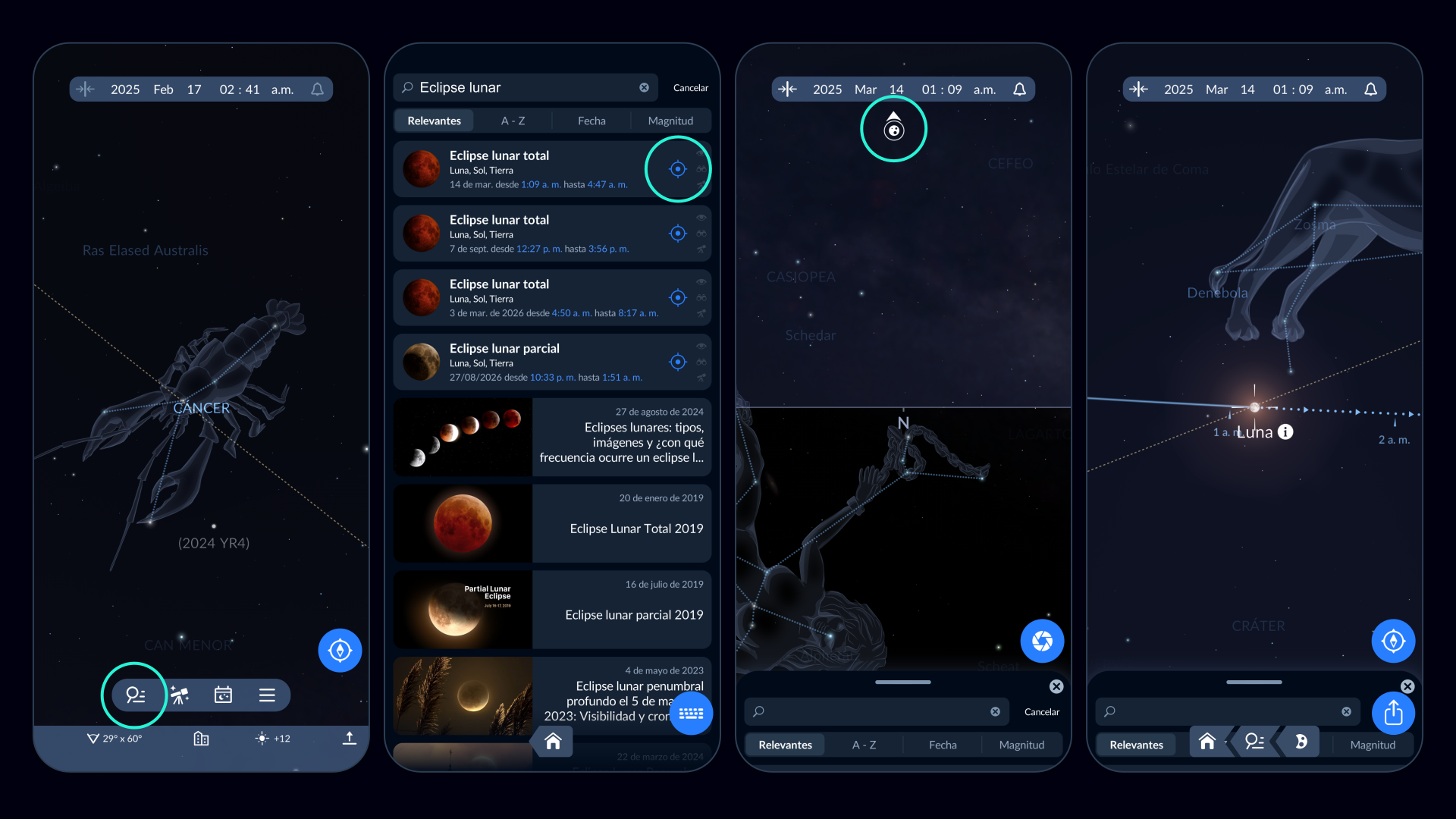 Para ver dónde estará la Luna eclipsada en el mapa celeste, toca el botón de mira. Para alinear la imagen de tu teléfono con el cielo real, toca el botón de la brújula y sigue la flecha blanca hasta que la Luna aparezca en tu pantalla. ¡Fíjate en su posición y planea tu noche de observación con anticipación!