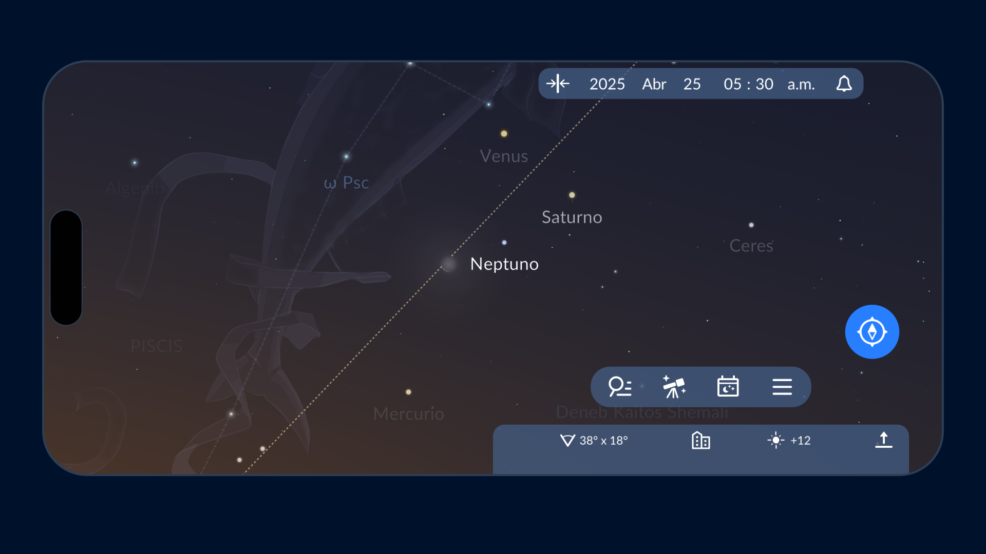 ¡El final de abril de 2025 es el mejor momento para observar a Venus! Brillando con una magnitud impresionante de -4.8, el planeta iluminará el cielo matutino junto con la Luna, Saturno, Mercurio y Neptuno. Busca a Venus justo antes del amanecer — aparecerá en el horizonte oriental como la deslumbrante "estrella de la mañana". Para facilitar la localización de Venus y otros objetos a su alrededor, usa la aplicación gratuita Star Walk 2 de astronomía.