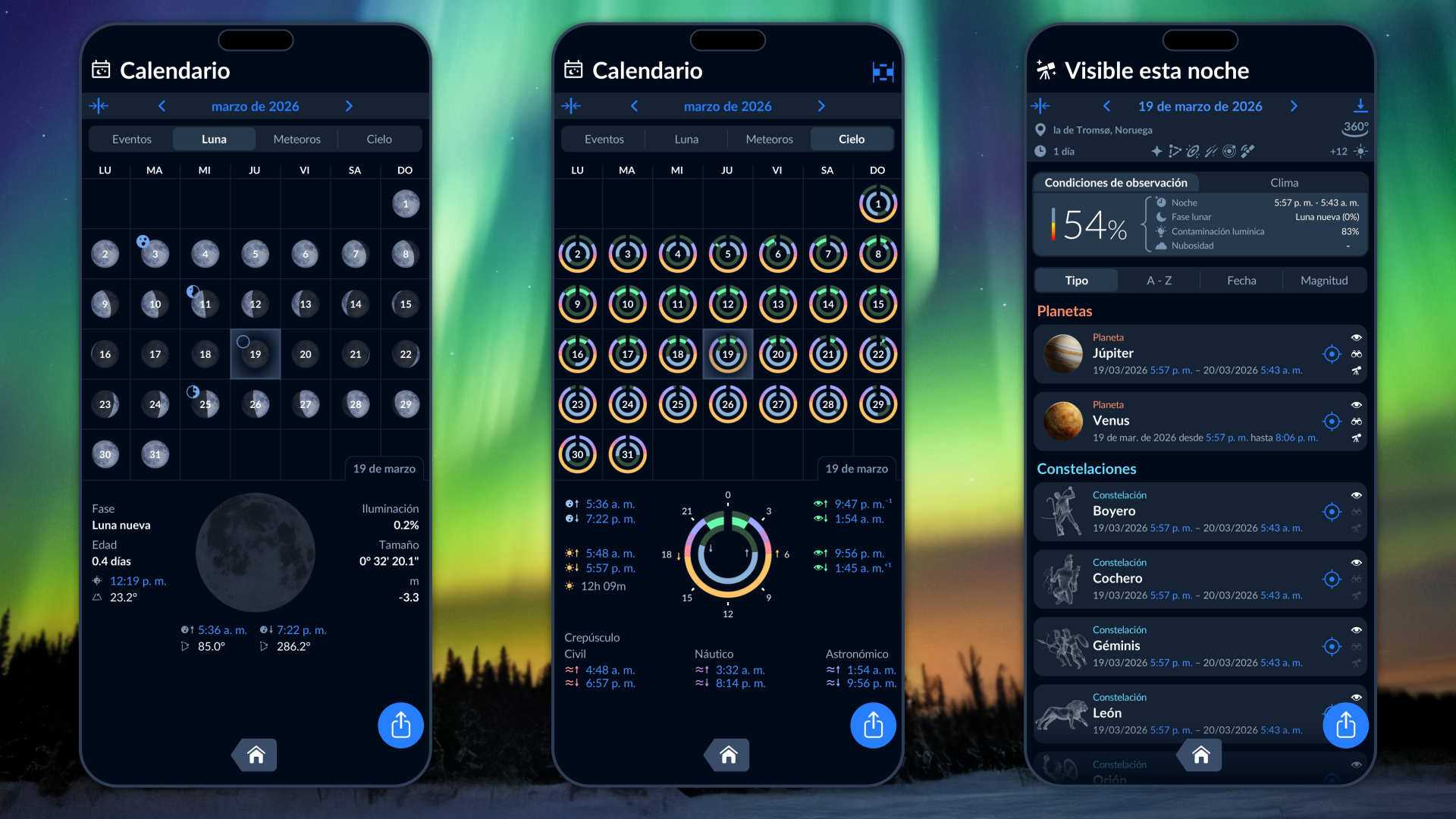 Para encontrar fácilmente la noche más oscura para observar auroras, usa la app Sky Tonight. Incluye un Índice de Observación que combina la fase lunar, el clima y la contaminación lumínica para mostrar qué tan buenas son las condiciones esta noche. En el calendario de la app, puedes consultar las fases lunares de cada día y ver cuándo comienza la oscuridad total y cuánto dura.