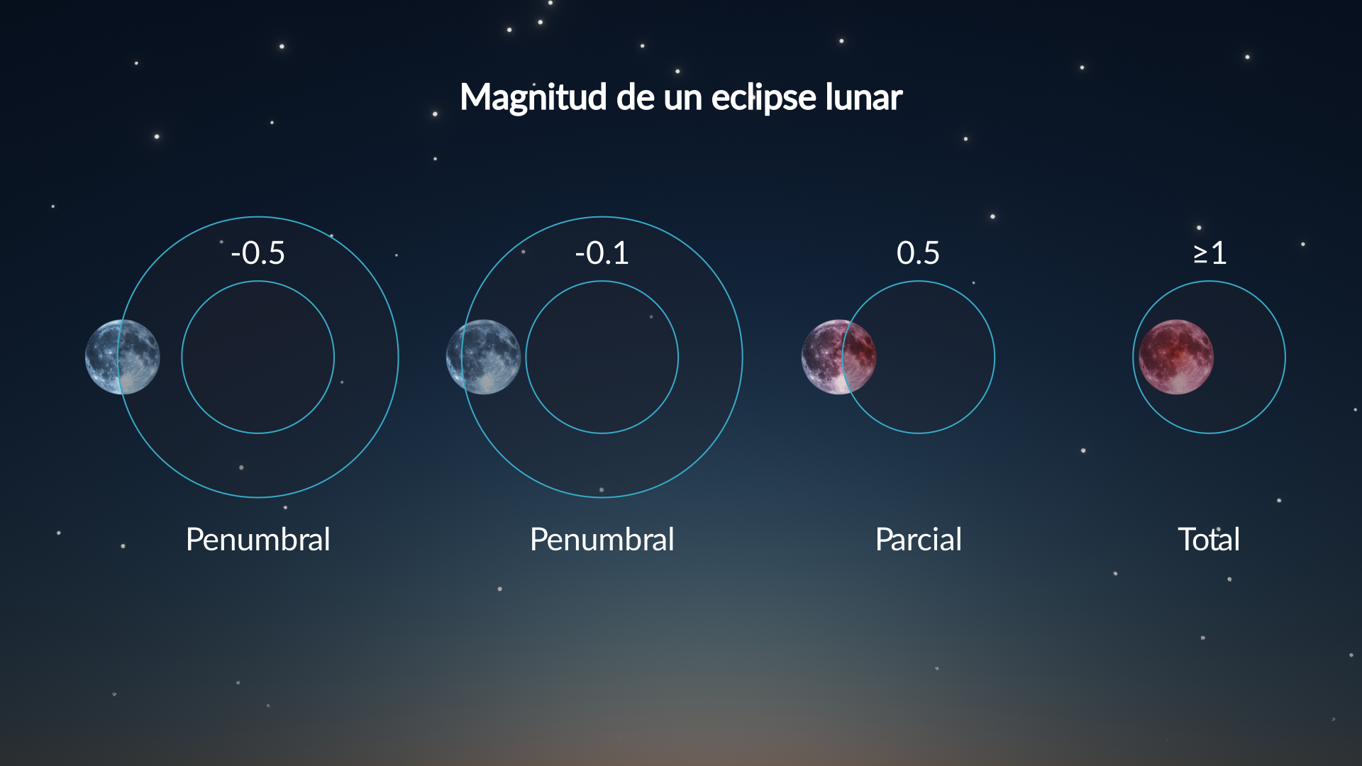 La magnitud muestra cuán profundamente la Luna se adentra en la sombra oscura central de la Tierra (la umbra) en el momento del máximo del eclipse.
